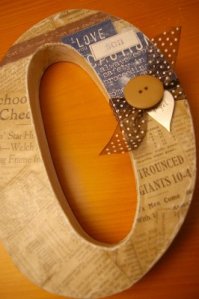 mache letters, 12 x 12 scrapbook paper, white acrylic paint, stickers for embellishments, ribbon, buttons, pop dots, glue dots, and M