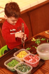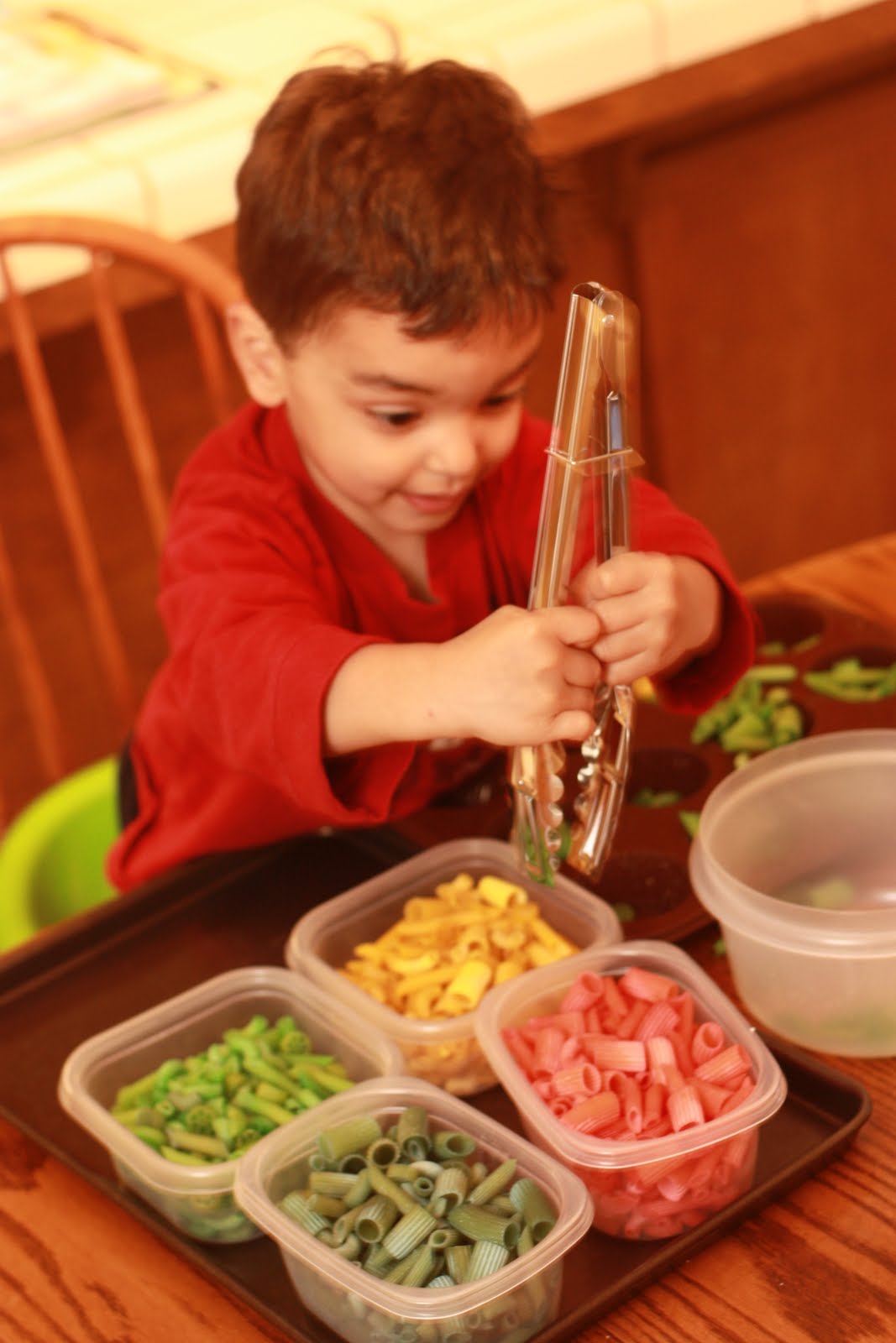 I will be making a trip over to the local teacher resource store to pick up a smaller set of tongs for him but he enjoyed trying to work the big ones (though difficult with the small pasta):