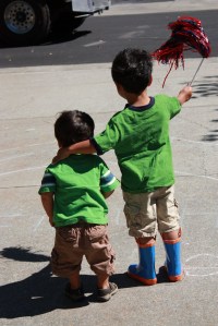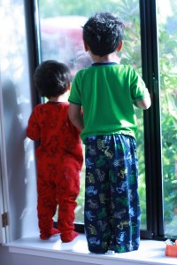 The boys start to hear the sound of the big trucks outside (our street is being repaved)…they are completely captivated: