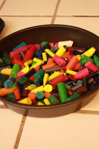 We start our project for the day. I have one boy who LOVES to color with crayons and another who loves to eat/break/throw them. Tyson gets very upset when crayons are broke. Or unwrapped. Shocking, don’t know where he gets that from. So, today, I am going to turn all the broken pieces (added some) into bigger disks. Some by color. Some rainbow. Tyson helped me unwrap crayons. Jake broke them. Worked out perfectly: