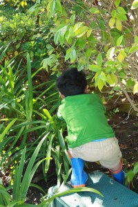 We have this area in our front yard, Ty calls it the “jungle”. I drew dinosaur footprints and he headed into the jungle on a dinosaur hunt: