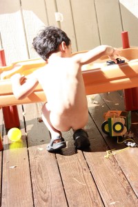And I knew it wouldn’t be long before my little Nature Boy got his clothes wet and did away with them all together. I chalked it up to “helping the potty training” efforts: