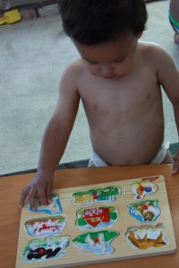 Jakey decided he had had enough. Came inside. I started to put lunch together. He found his puzzle:
