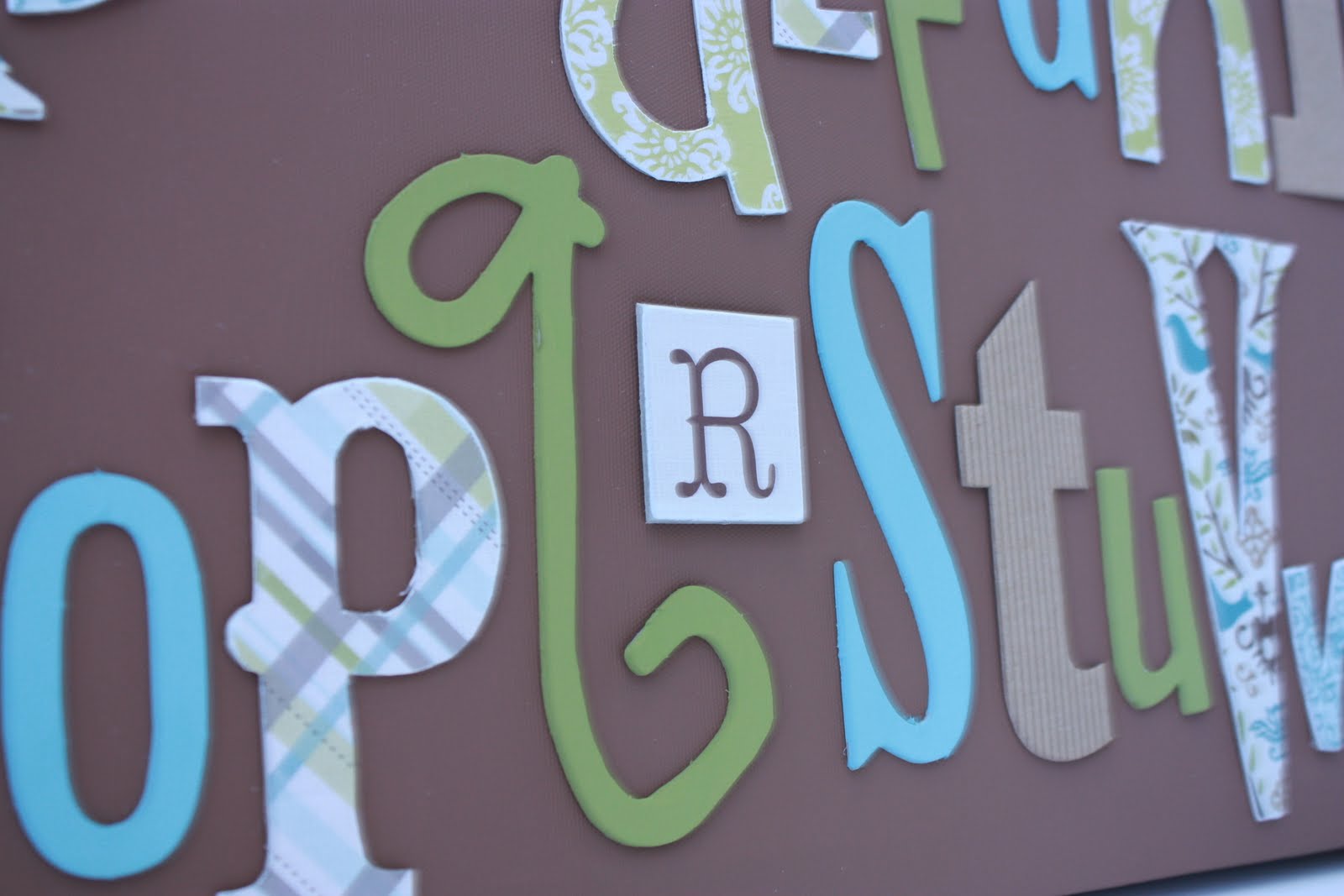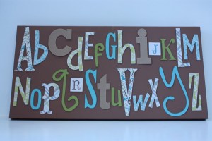 I have a *small* collection of chipboard (read: an entire drawer full) and wanted to make something for our family room using the colors of the throw rug we bought months ago. Many stores showcase pictures of alphabet walls or alphabet pictures…all way TOO expensive. Or way too time consuming. Here is my go at an alphabet canvas. It took two coats of acrylic paint to cover the existing painting. I then laid out the chipboard letters: