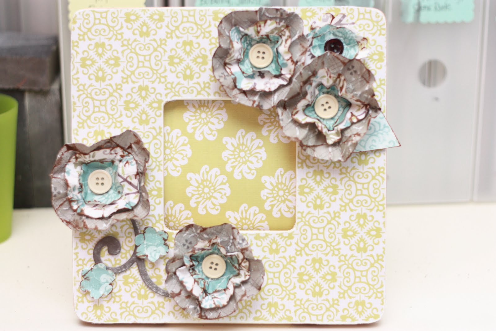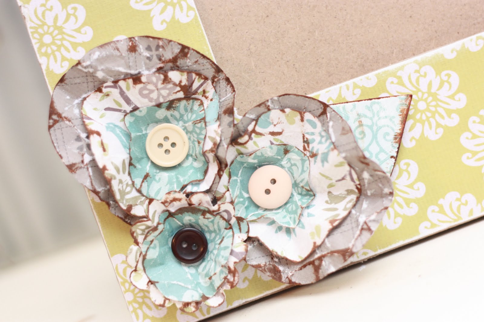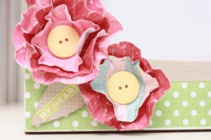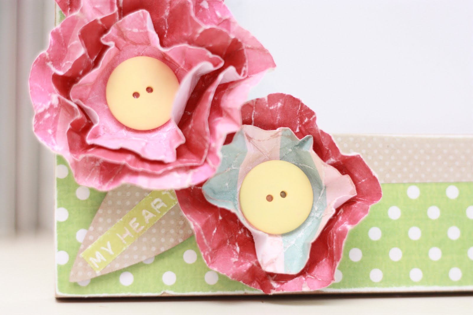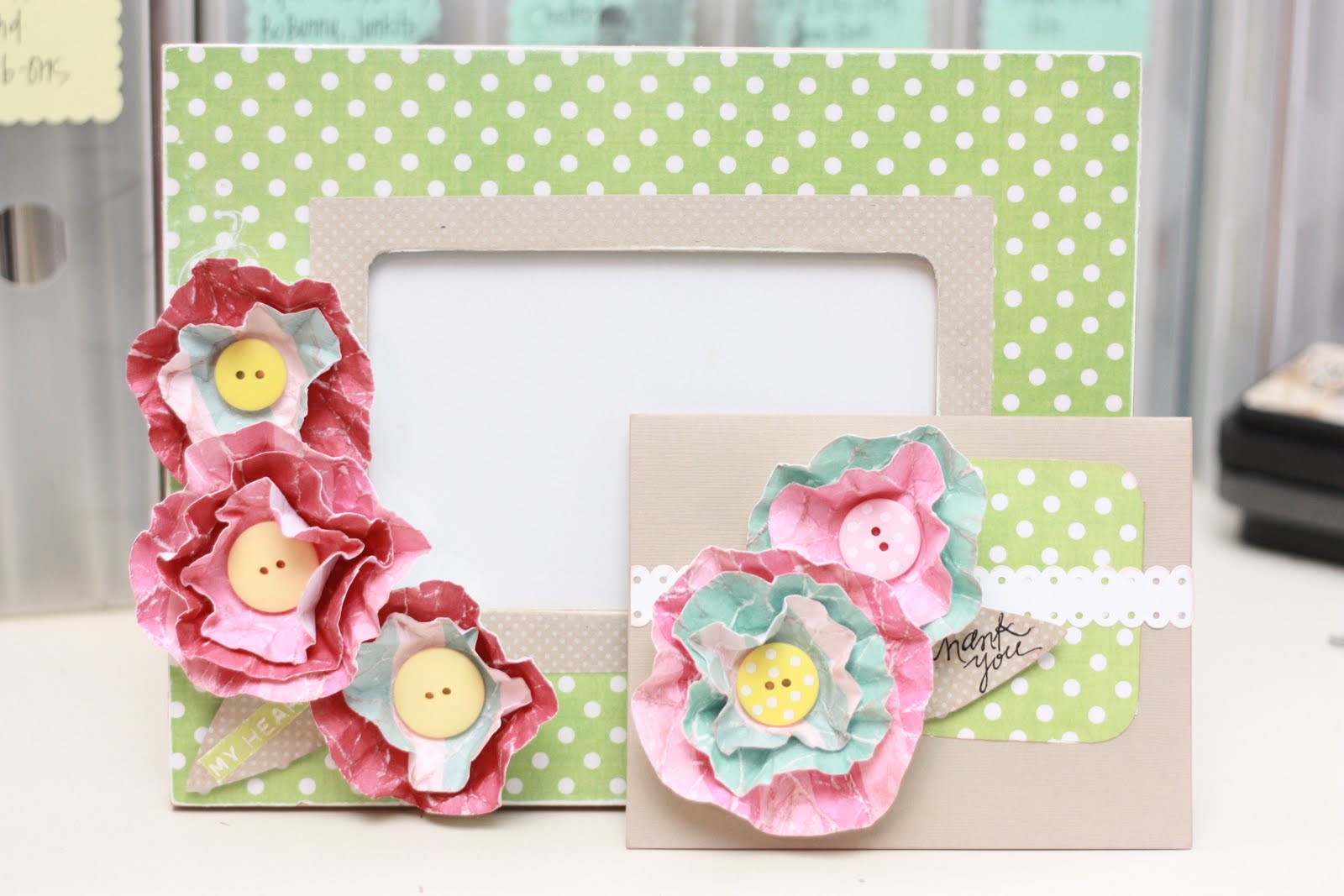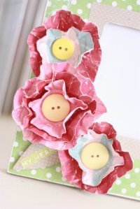 I used 5 pieces of 12 x 12 paper (plus a little craft paper for the frame and leaves). The green dots for the frame. Four coordinating pieces for the flowers. You cut three varying sized strips. Make the strips into squares. Cut circles. The more imperfect the circle, the cuter the flower. Spray circles with water or a distress/shimmer ink and crinkle. Unwrap, distress edges. Layer the circles: I did some centered and then some off center. Like the look both ways. I used the leftover flowers for coordinating cards: