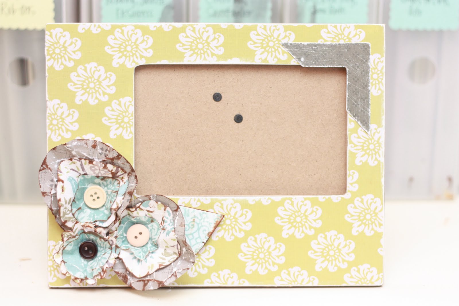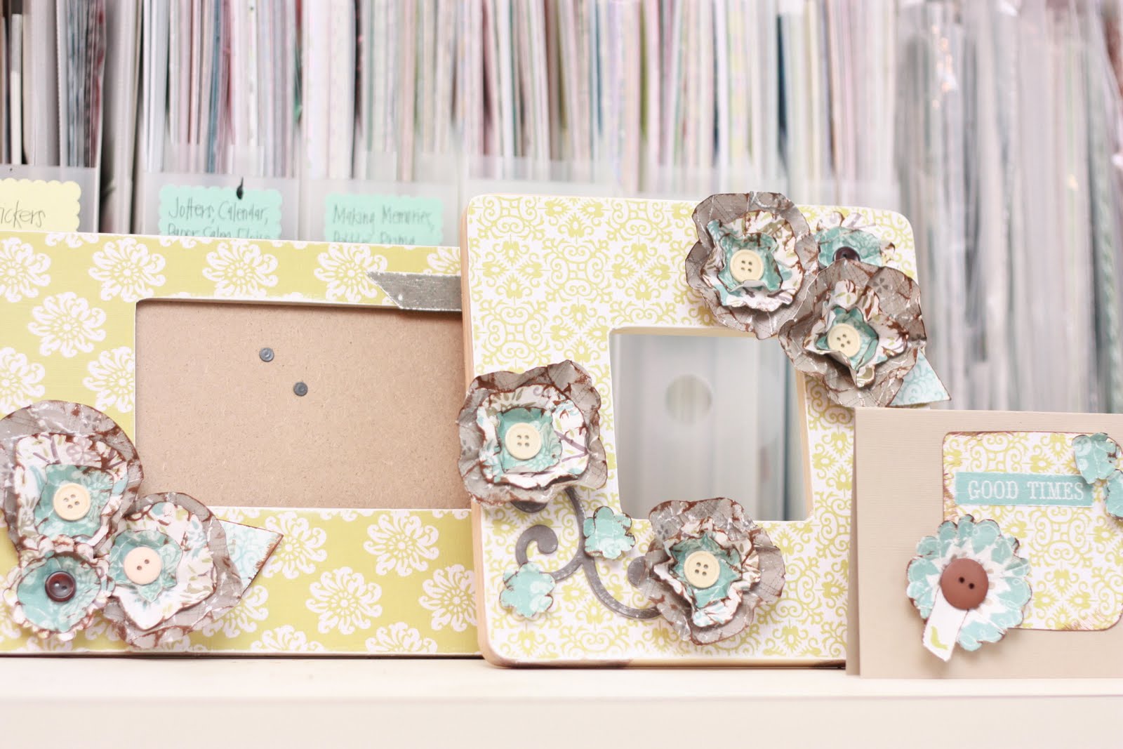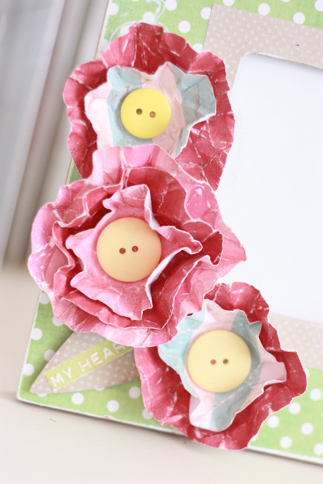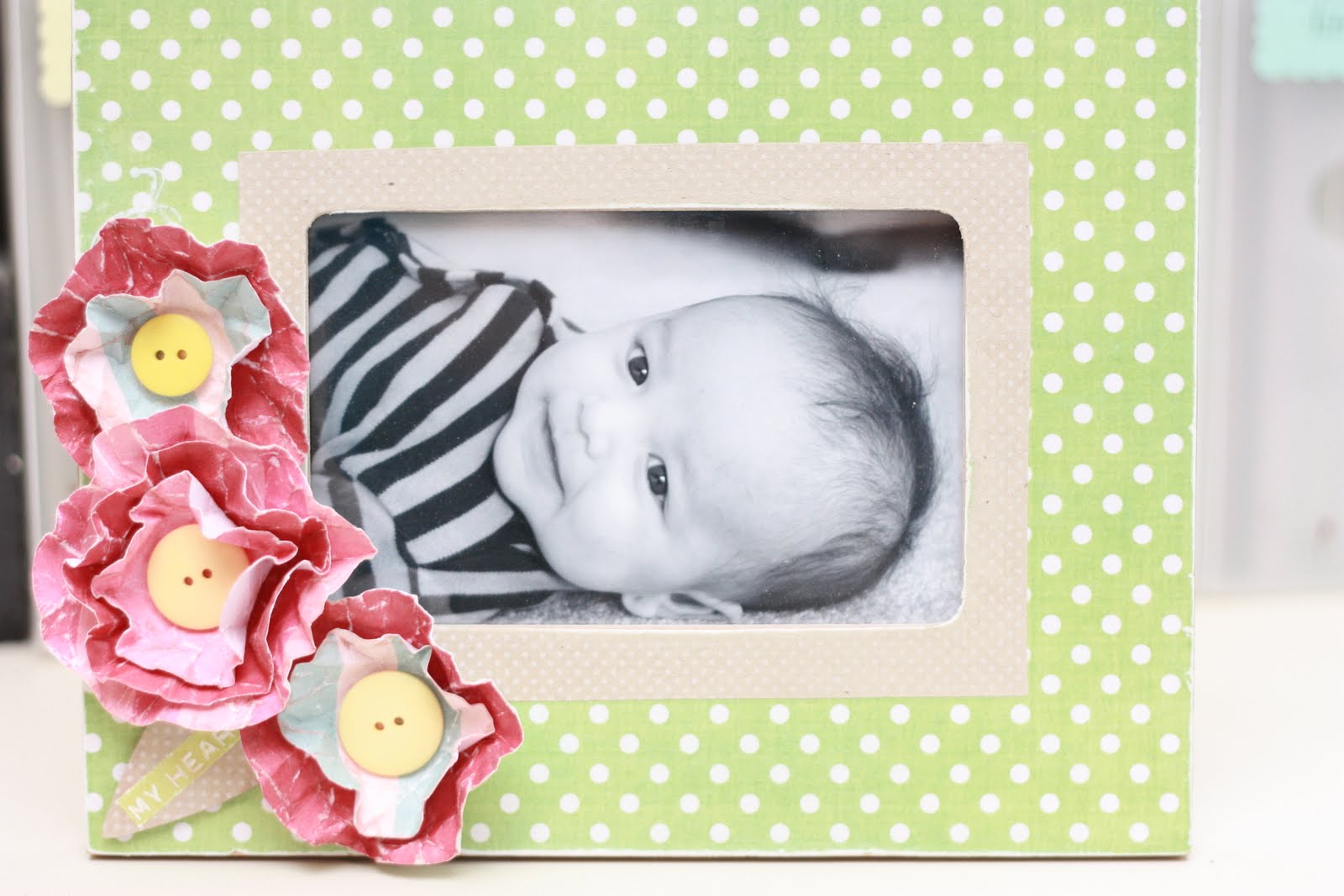 I used 5 pieces of 12 x 12 paper (plus a little craft paper for the frame and leaves). The green dots for the frame. Four coordinating pieces for the flowers. You cut three varying sized strips. Make the strips into squares. Cut circles. The more imperfect the circle, the cuter the flower. Spray circles with water or a distress/shimmer ink and crinkle. Unwrap, distress edges. Layer the circles: I did some centered and then some off center. Like the look both ways. I used the leftover flowers for coordinating cards: