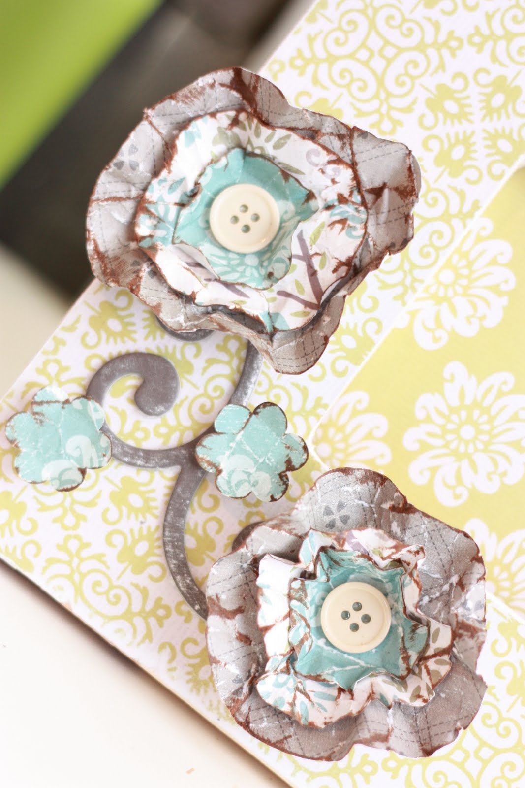 The flowers themselves are super easy. A little time consuming but overall easy to do. There are so many embellishment options: ink the edges, distress the edges, spray paper with distressing ink, spray papers with glitter ink, etc, etc, etc. The crafty wheels are turning: