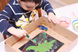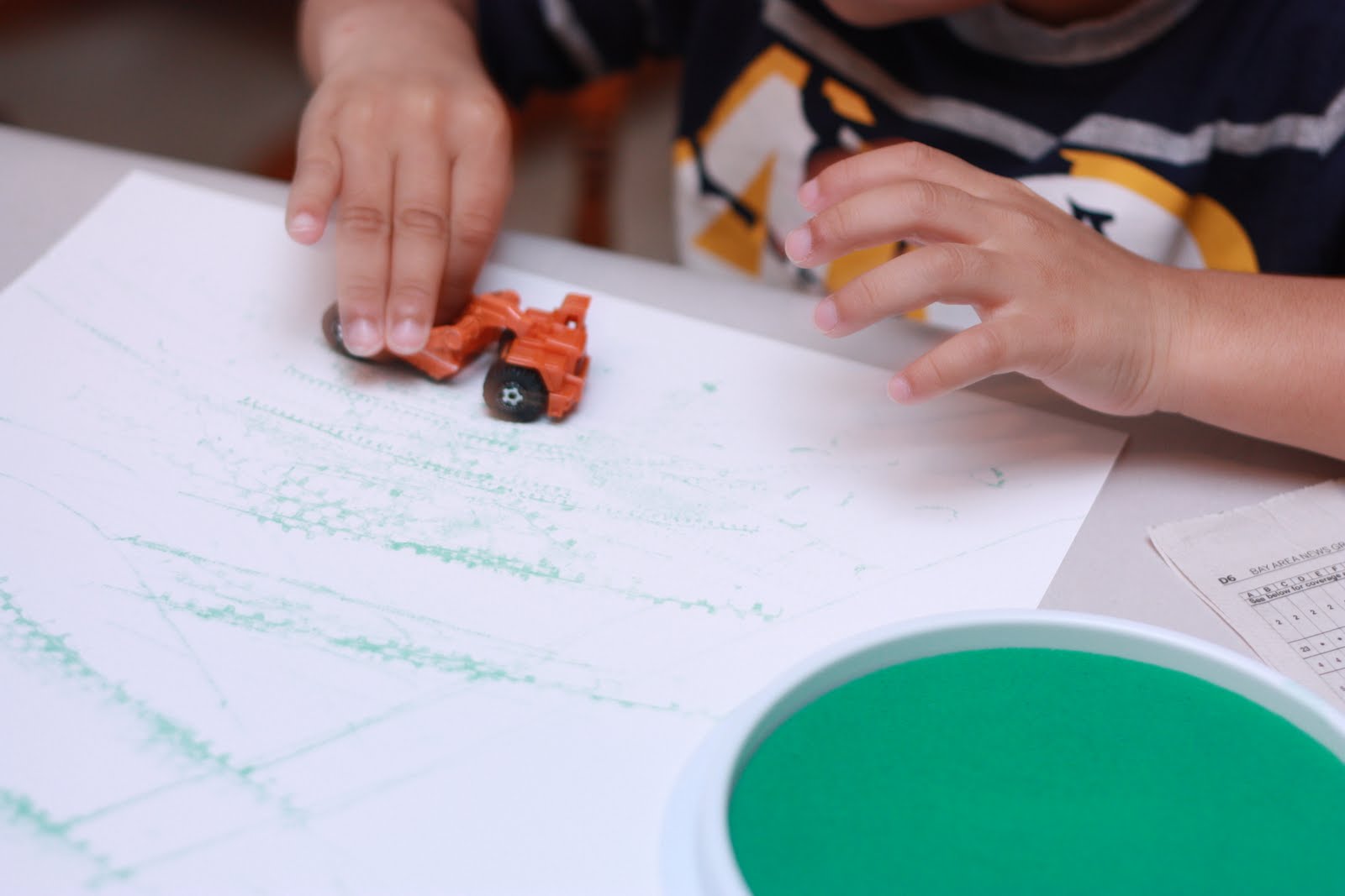 We tried big stamp pads first. Ty had fun but the cars didn’t really pick up enough ink to make the prints stand out: