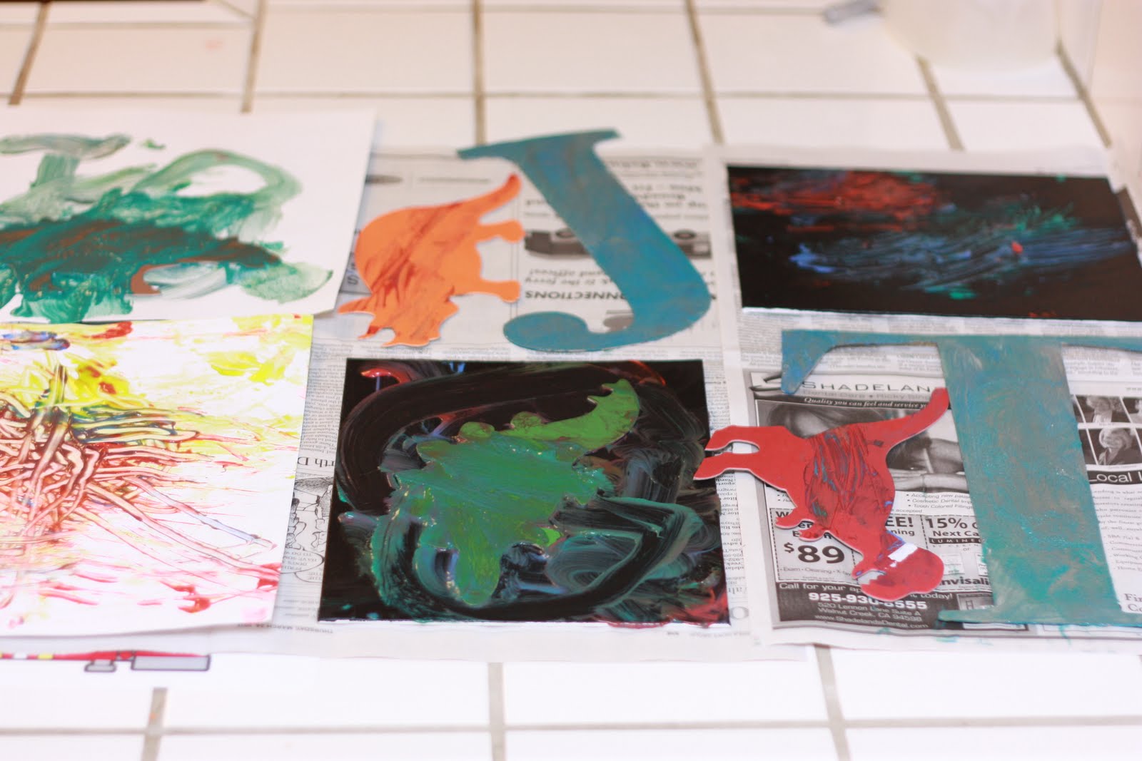 I found some BIG letters and let them each paint one. First with blue and green. And then with glitter glue. The boys apparently love the bling. Biggest hit of the day: