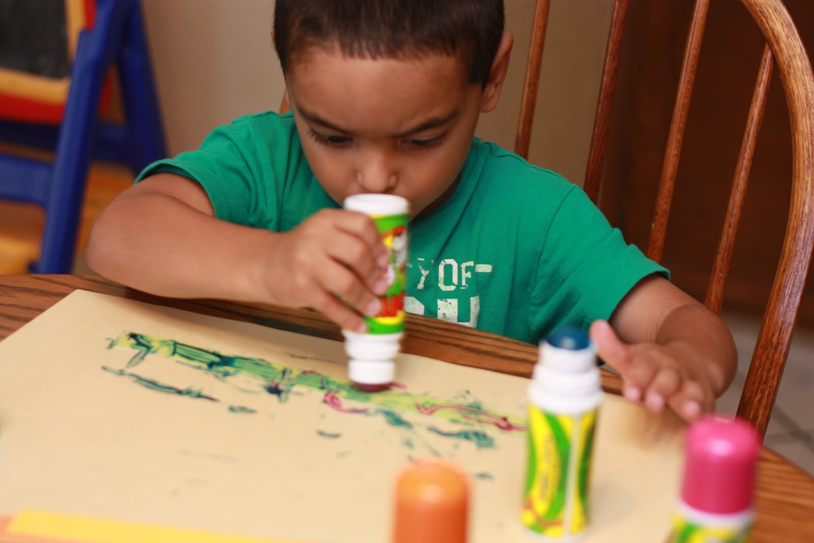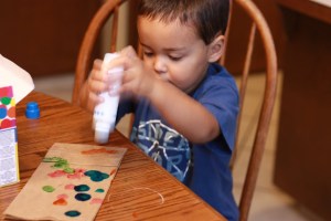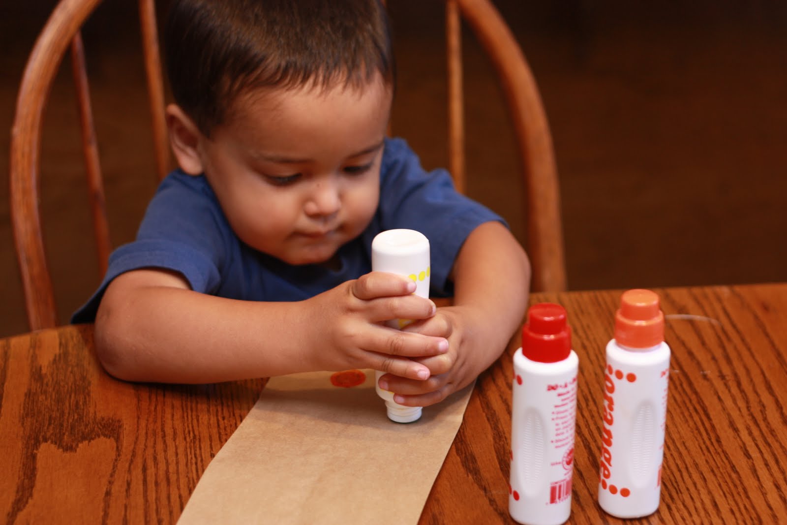 Meanwhile, Jake decorated lunch bags with his favorite dabber dot markers. The bags would become the body of the turkey.