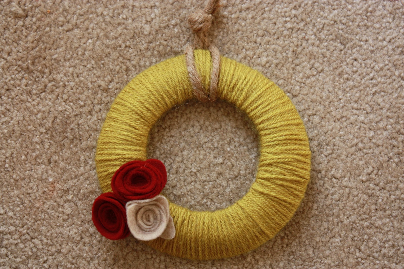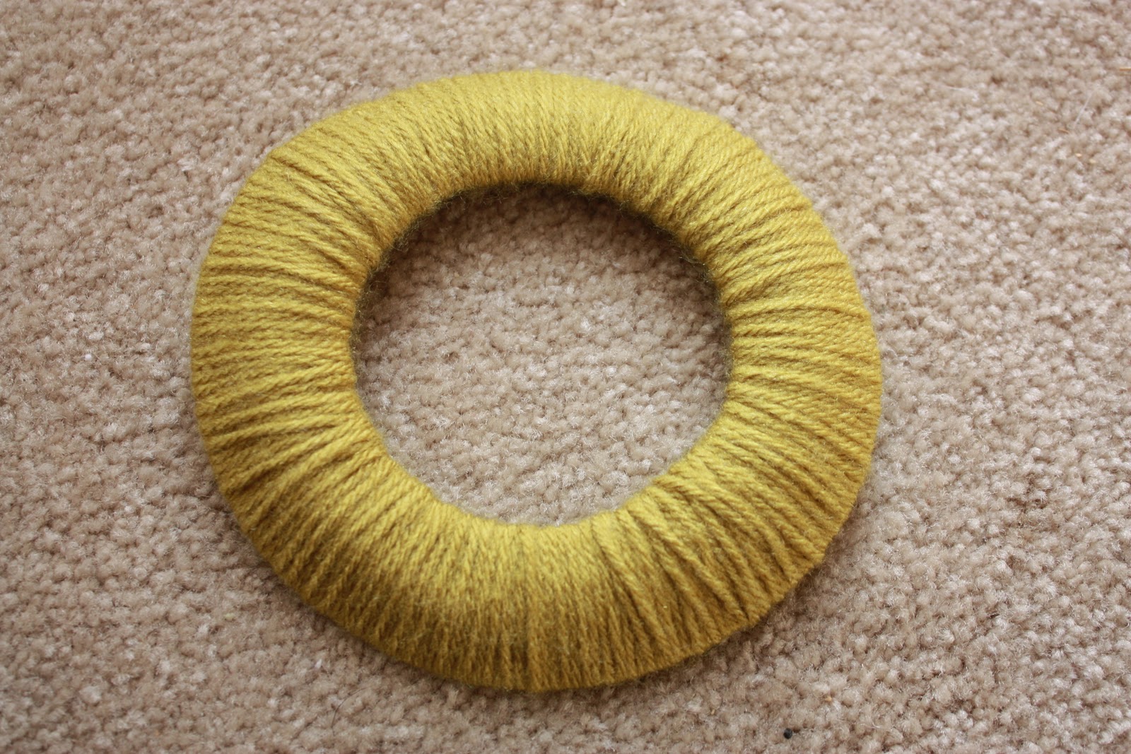 Cut out the center of paper plates (I used three to make sure they would be sturdy enough to hold the wreath shape). Use a glue gun to place a small strip of glue, adhere yarn, and start wrapping. And wrapping. And wrapping.