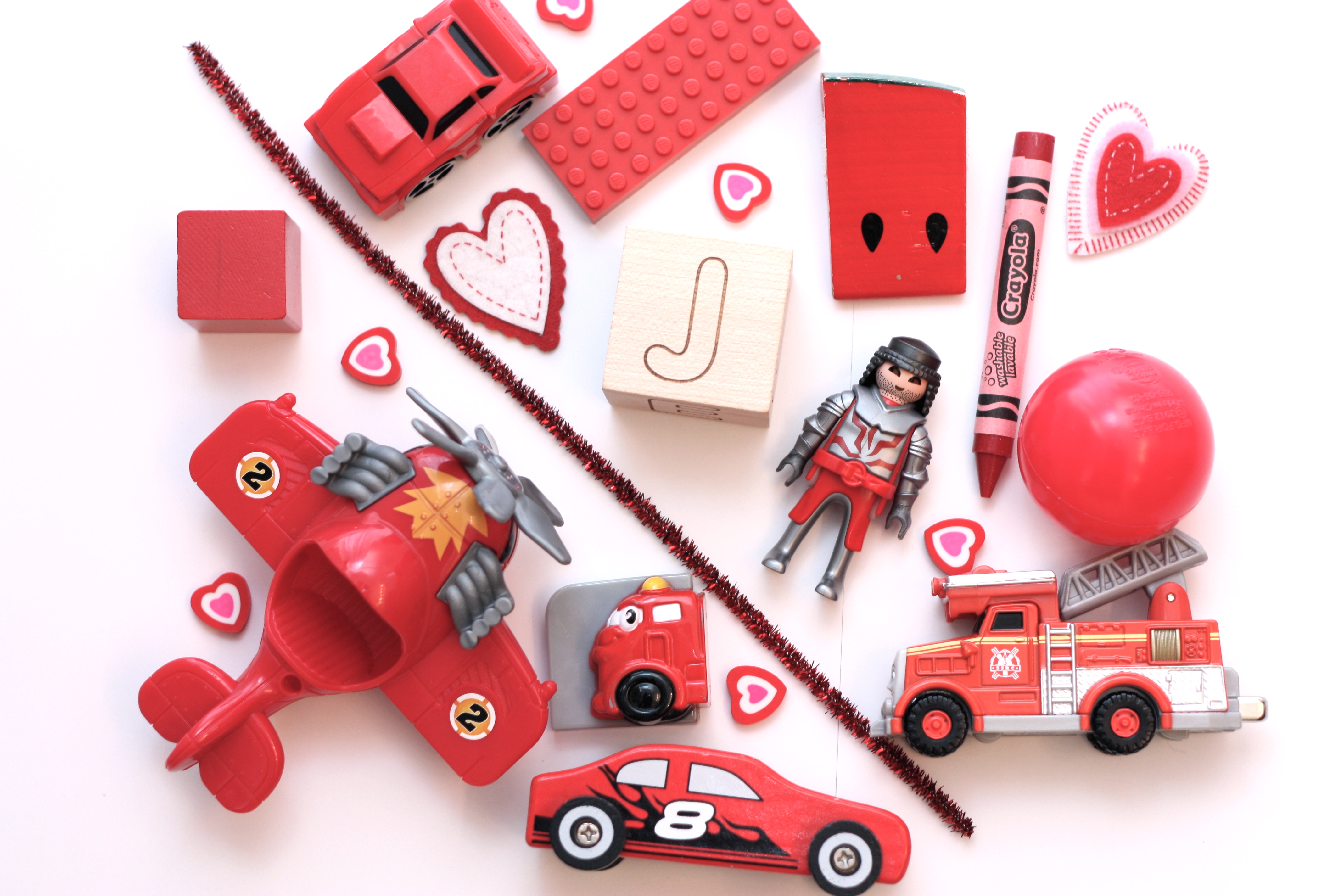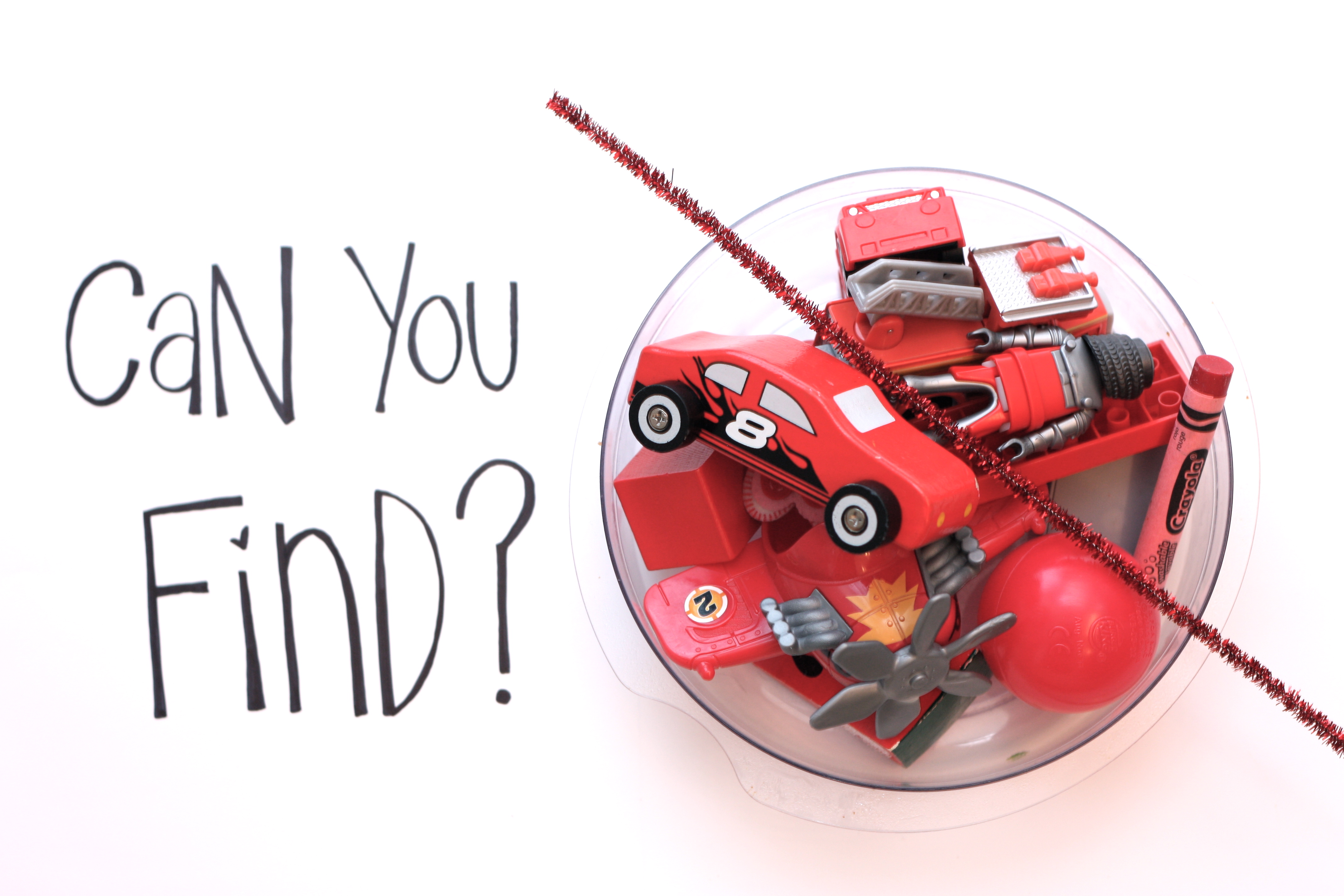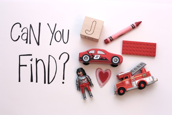 Super easy. All you need is a white piece of paper, pen, and collection of your kiddo’s red toys: