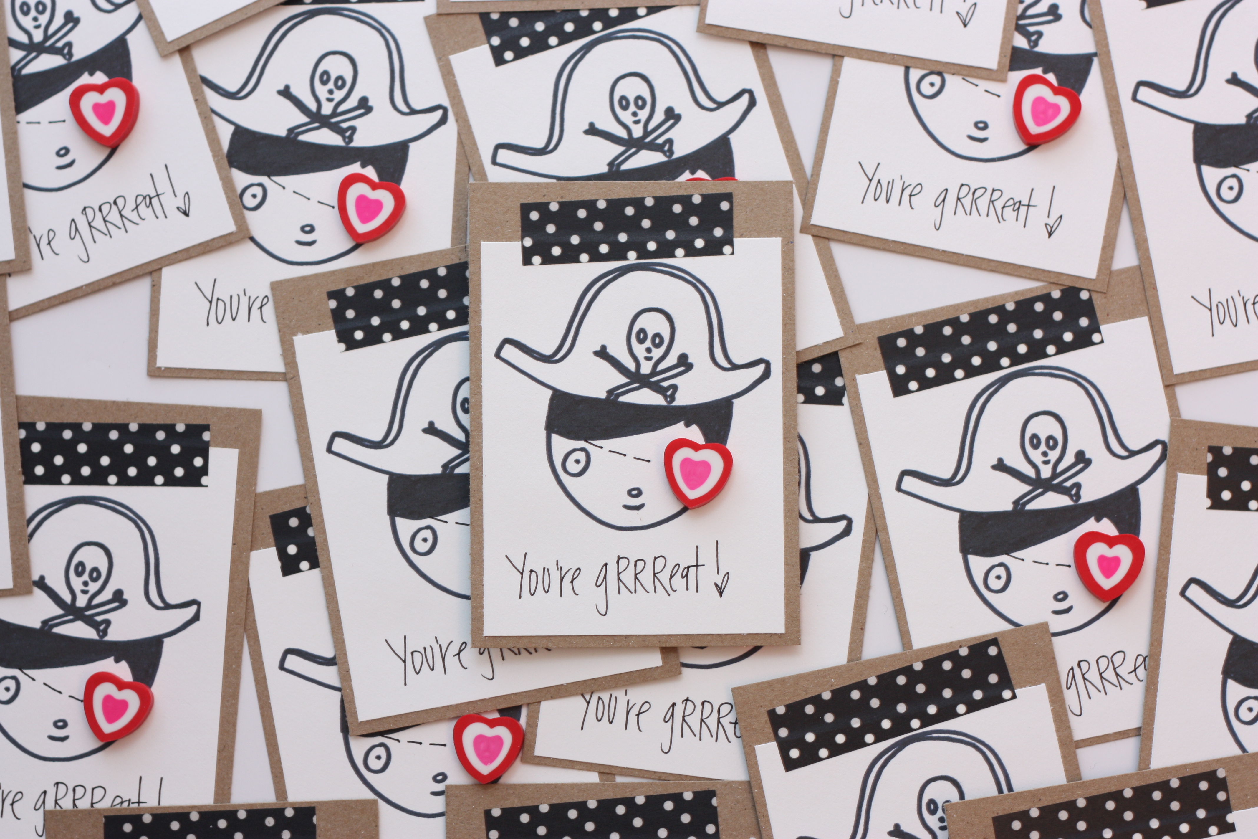 For big bit’s class, pirate valentine’s (free printable) with a heart eraser (Target Dollar Spot):