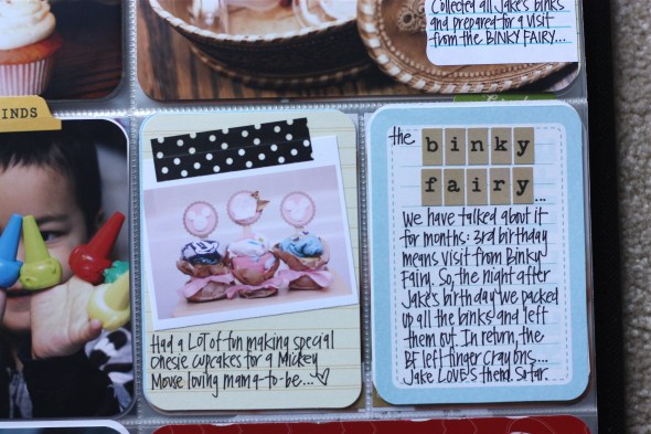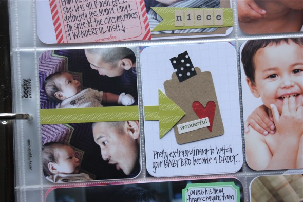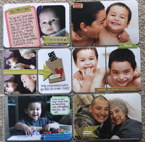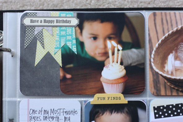 These pages are fabulous and totally pinworthy! Some absolutely amazing photos here – Jacob’s wonderment at cake and candles, boys running round and playing and your brother and his child – moments captured beautifully. And your new found passion for the little flag thingies has added a little special something to your pages. I love the way you cut off part of a journaling card and add it to a photo – I’d never thought of doing that (but I may have to scraplift it if that’s ok?).