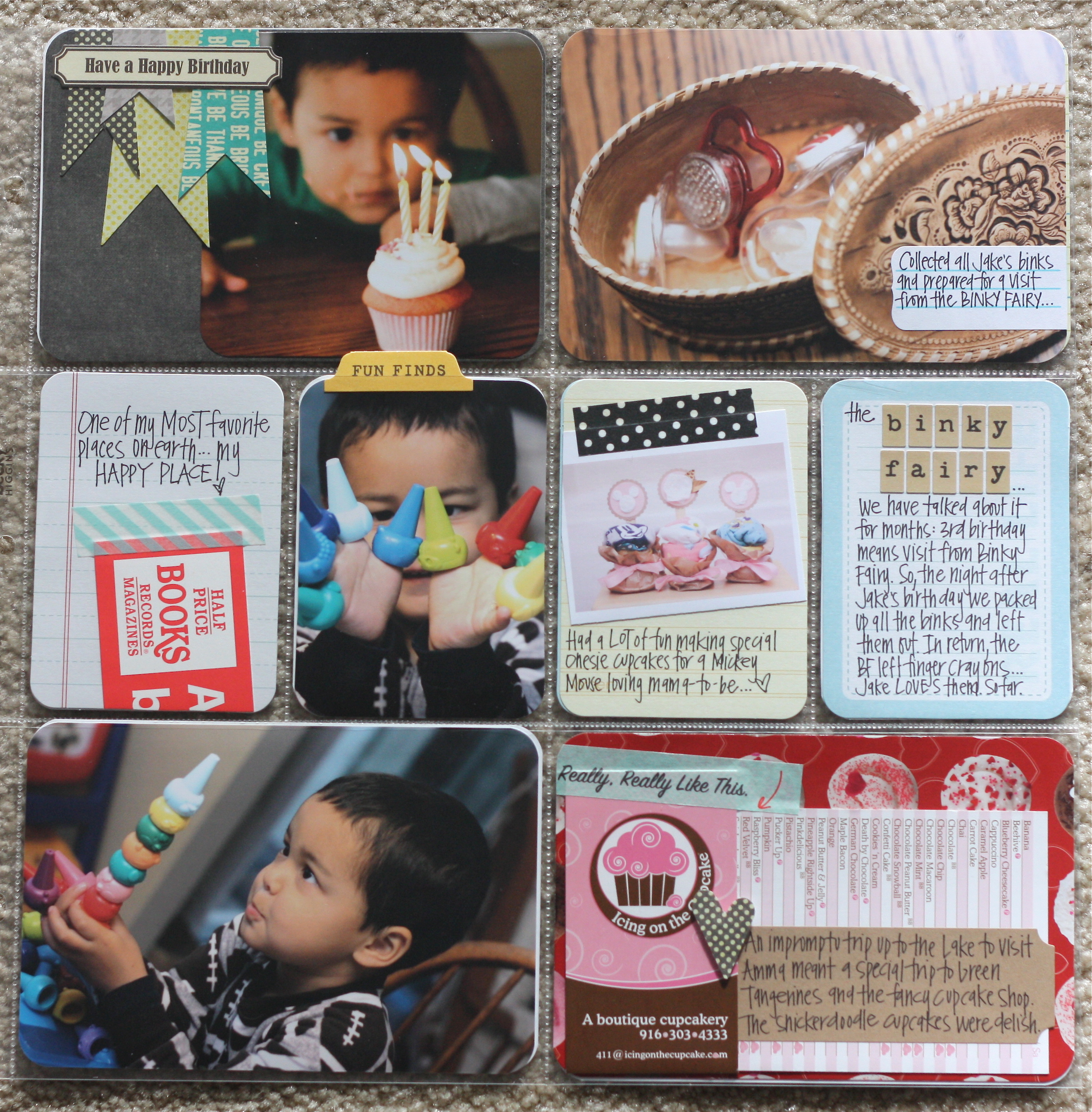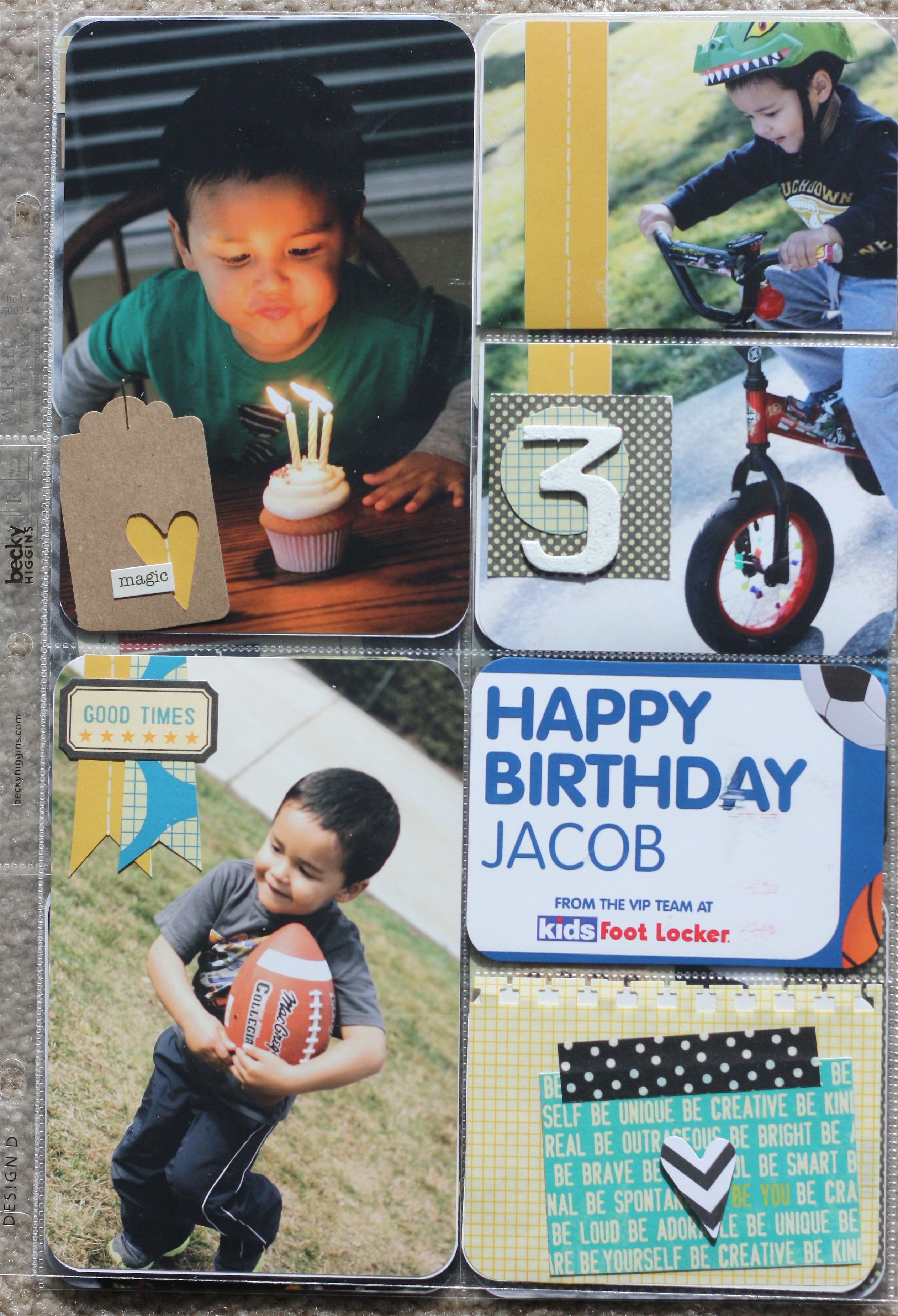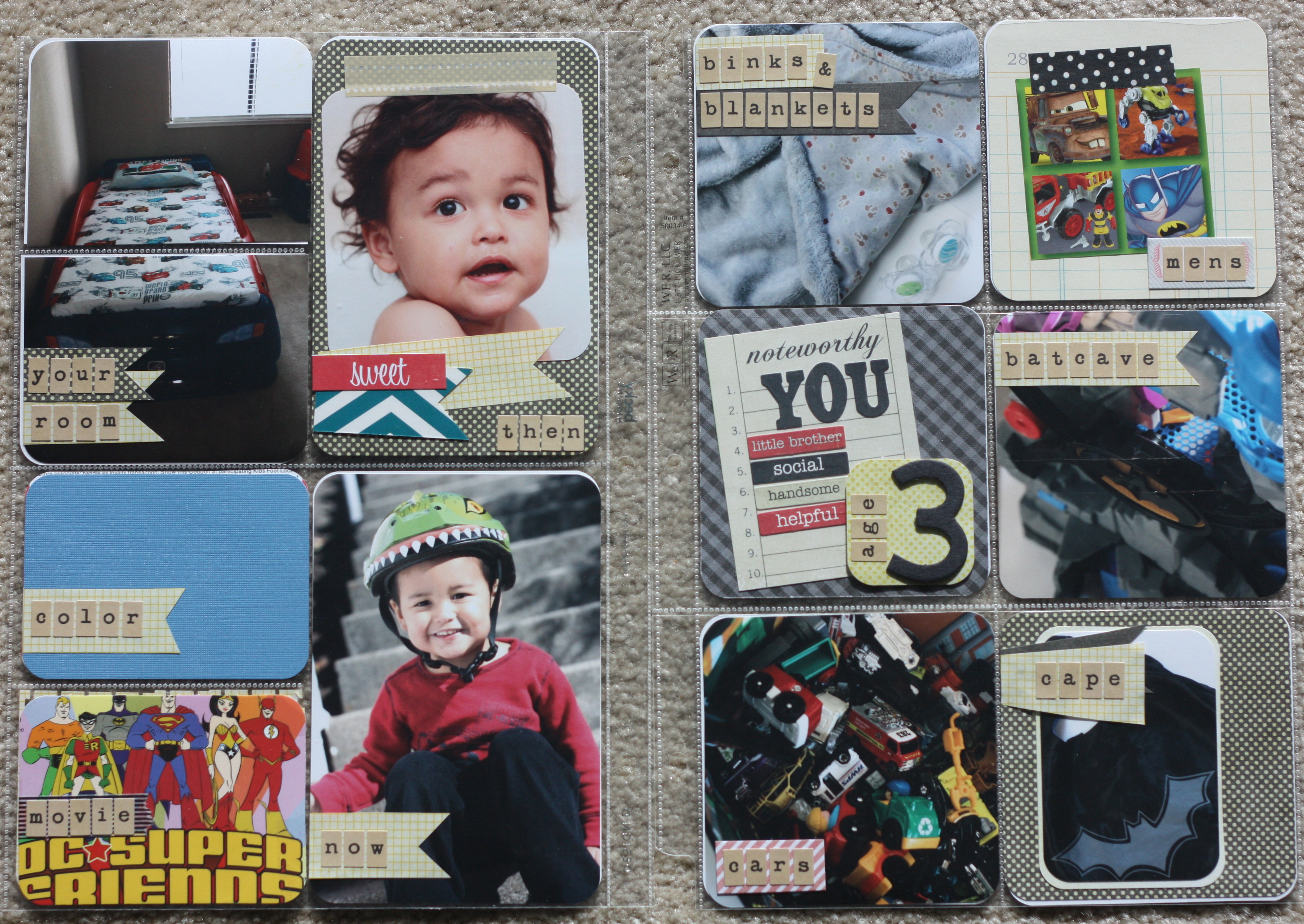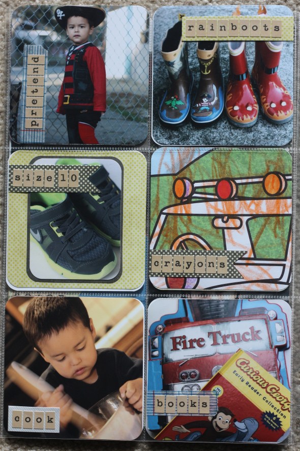 Inside pages of insert: Jake’s favorite things at age 3 (left side is Design D cut down, right side is a 12 x 12 9 pocket page, cut down):