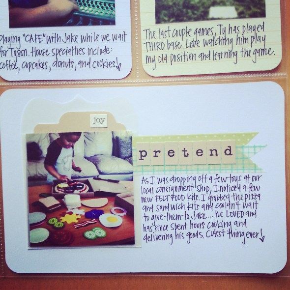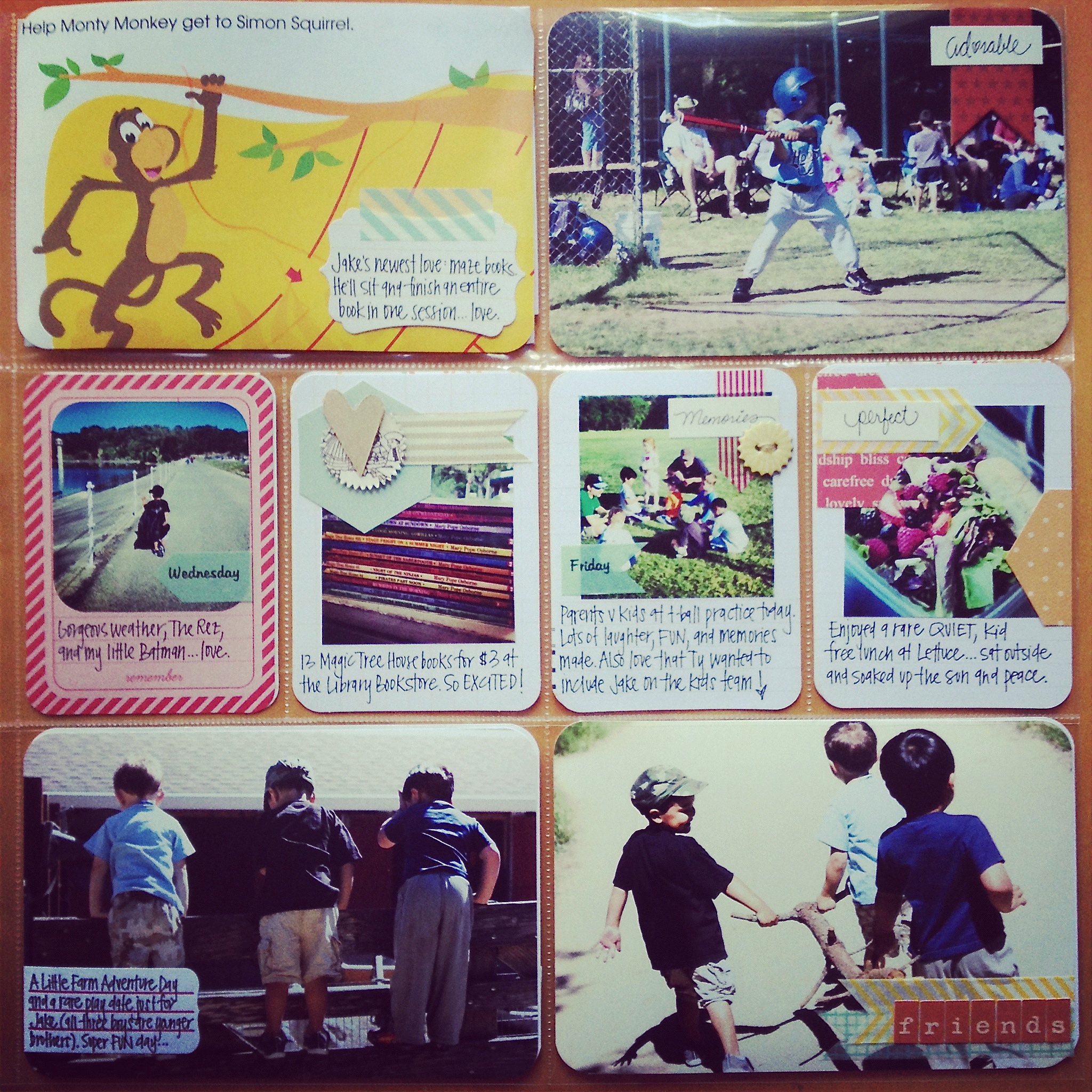 An example of forgetting where photos are to be placed and what was planned for one of the 4 x 6 photo slots. I typically keep up with the photo portions by printing, cutting and placing the photos in the sleeves; however, for some reason, this week’s photos were not all placed beforehand. I had one empty spot and found a maze page of Jake’s that fit perfectly.