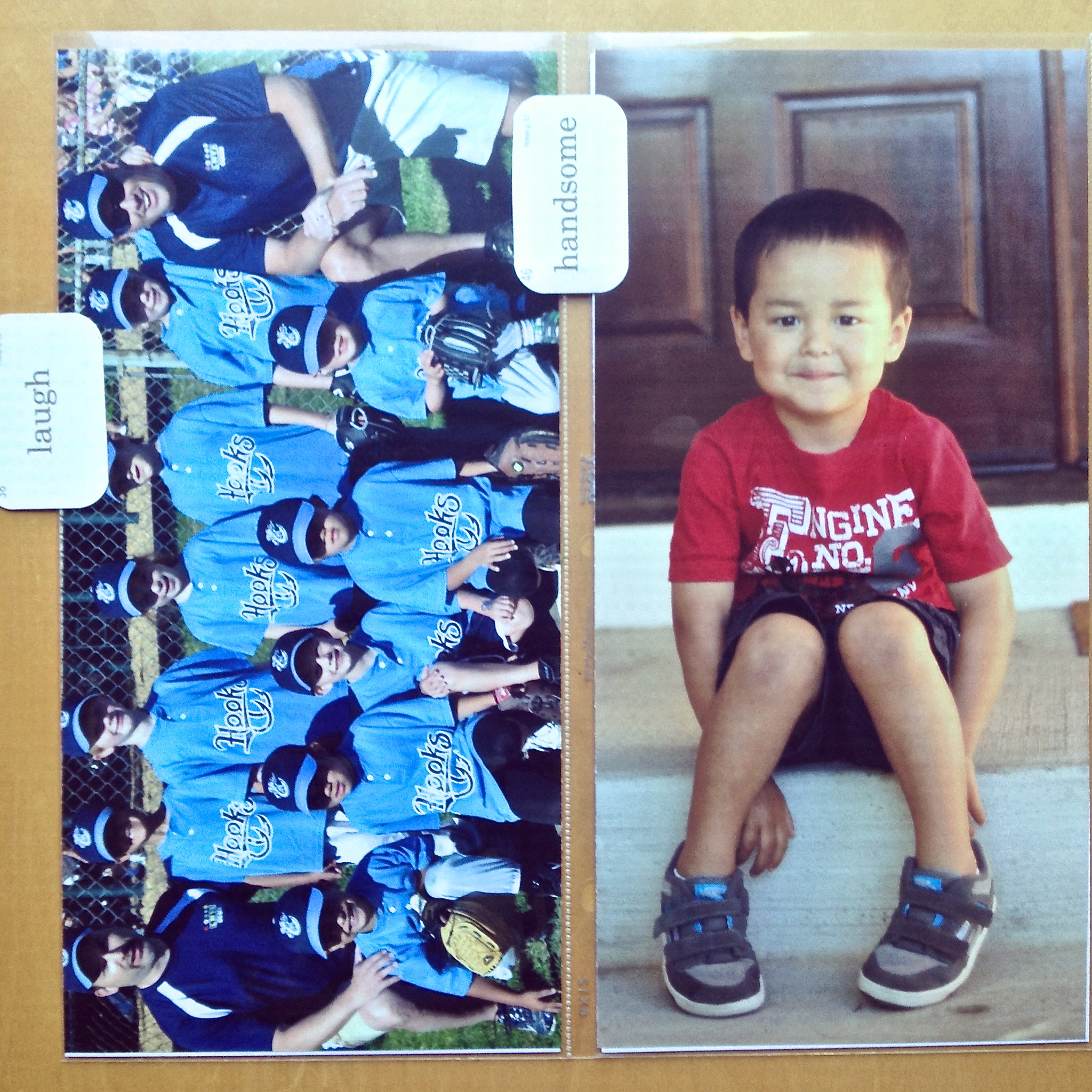 Inserts are photos printed out as 8 x 12 and trimmed down to fit the 6 x 12 pockets. I cut out the words and used them as tabs…