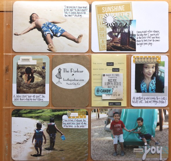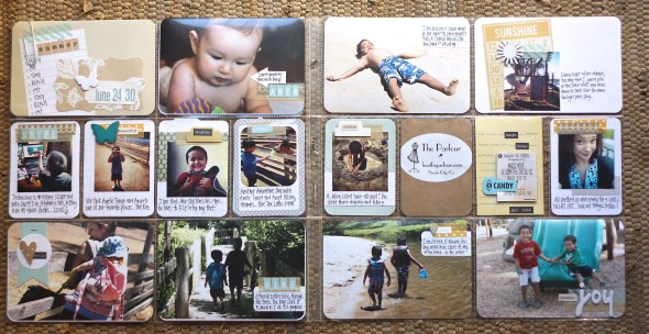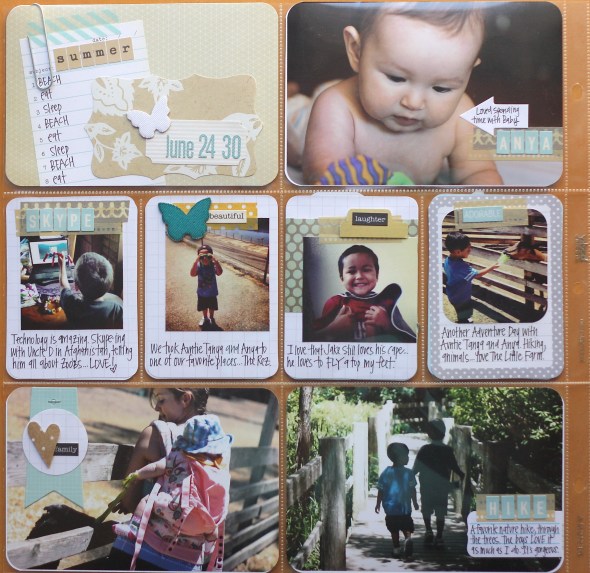 Full spread. Definitely need the continuity of a color scheme, the mis-matched layouts bug me. It is all I can do to not go back and redo them…still enjoying the process. Loved being able to look back at the last six months. I am even enjoying reliving some of our summer adventures while I go back and finish the journaling…