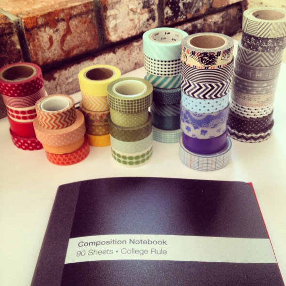 Inspired by the app and intent on ACTUALLY COMPLETING a Gratitude Journal, I wanted to make something to keep actual copies of the photographs and handwrite sentiments. Many of the composition notebooks have been marked down at Target, I found this particular notebook for .37 cents. Giddy about having the chance to finally use my embarrassingly large washi tape stash, I went to work…