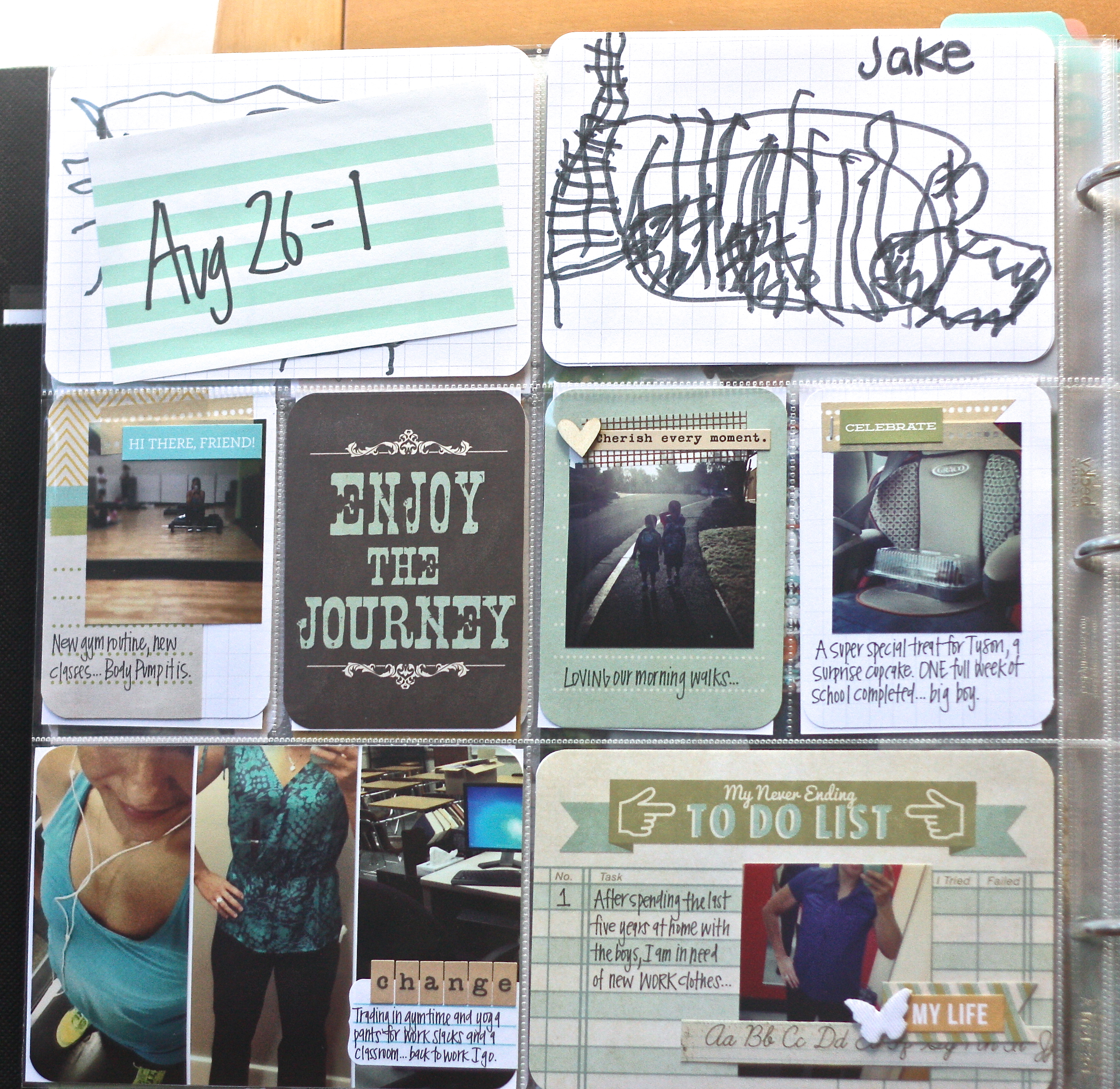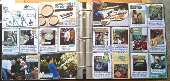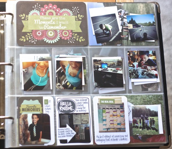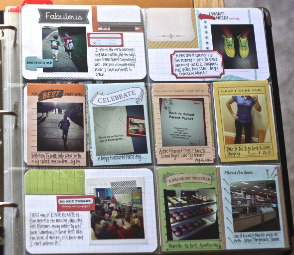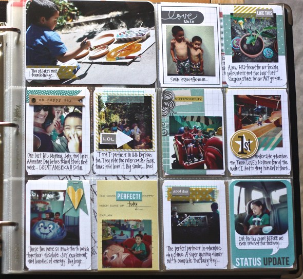 I don’t really have a “theme” per week. I often just fill in the pockets with pictures as they fit. For this week’s layout, I am using some of the new journal cards from Target’s We R Memory Keepers: Albums Made Easy line. Love the colors and ease: