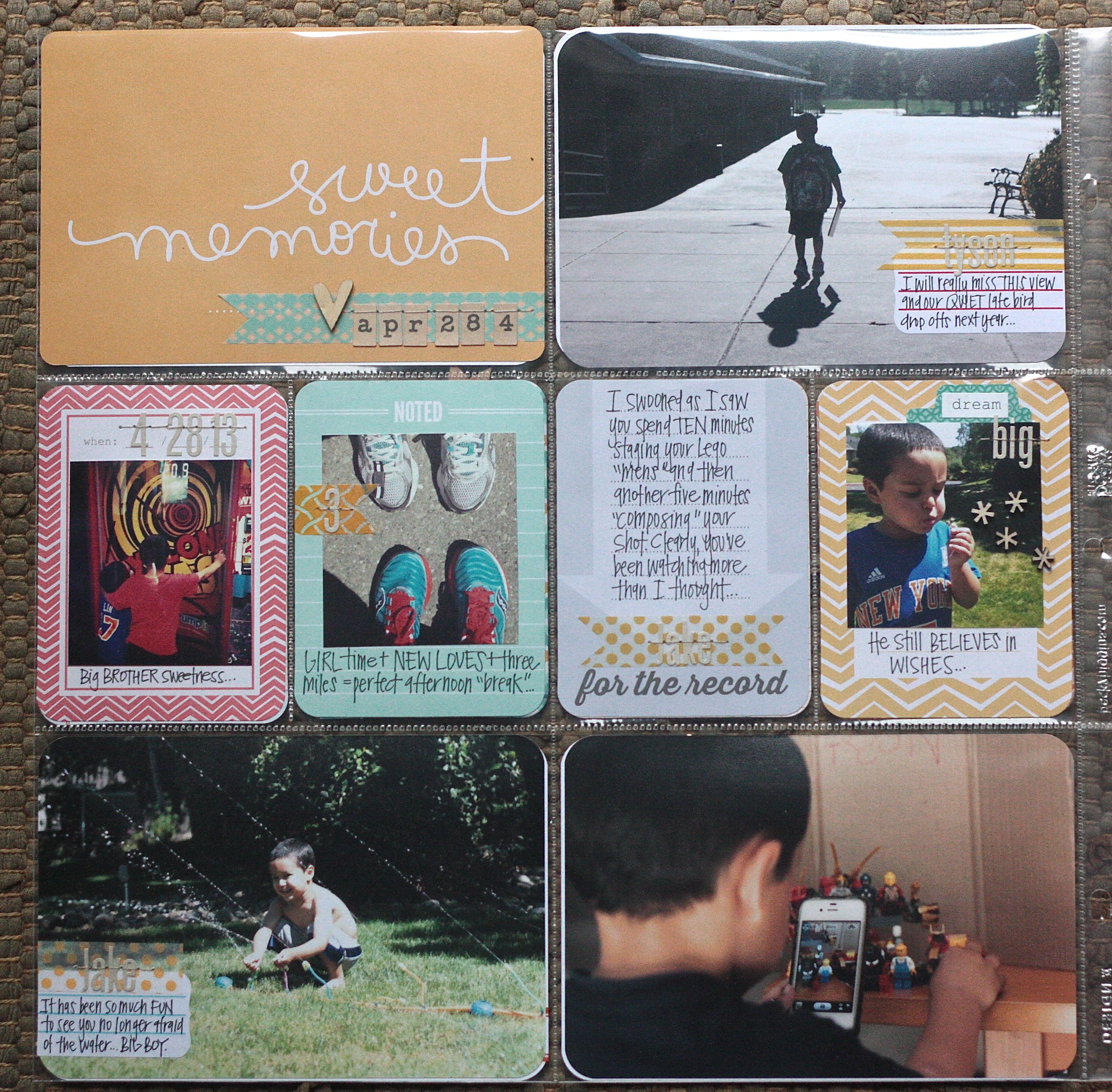 I have put this off for years. It has been almost three years since I last took on the “Day in the Life” challenge. I wanted to include the photos in some way in my Project Life. After seeing this months Studio Calico PL Kit, the journal cards made it easy. I printed out all the photos from the day. My plan was to include a few in this week’s layout and then use the rest as fillers if need be (as they represent things we do almost daily). I kept the actual layout very simple: