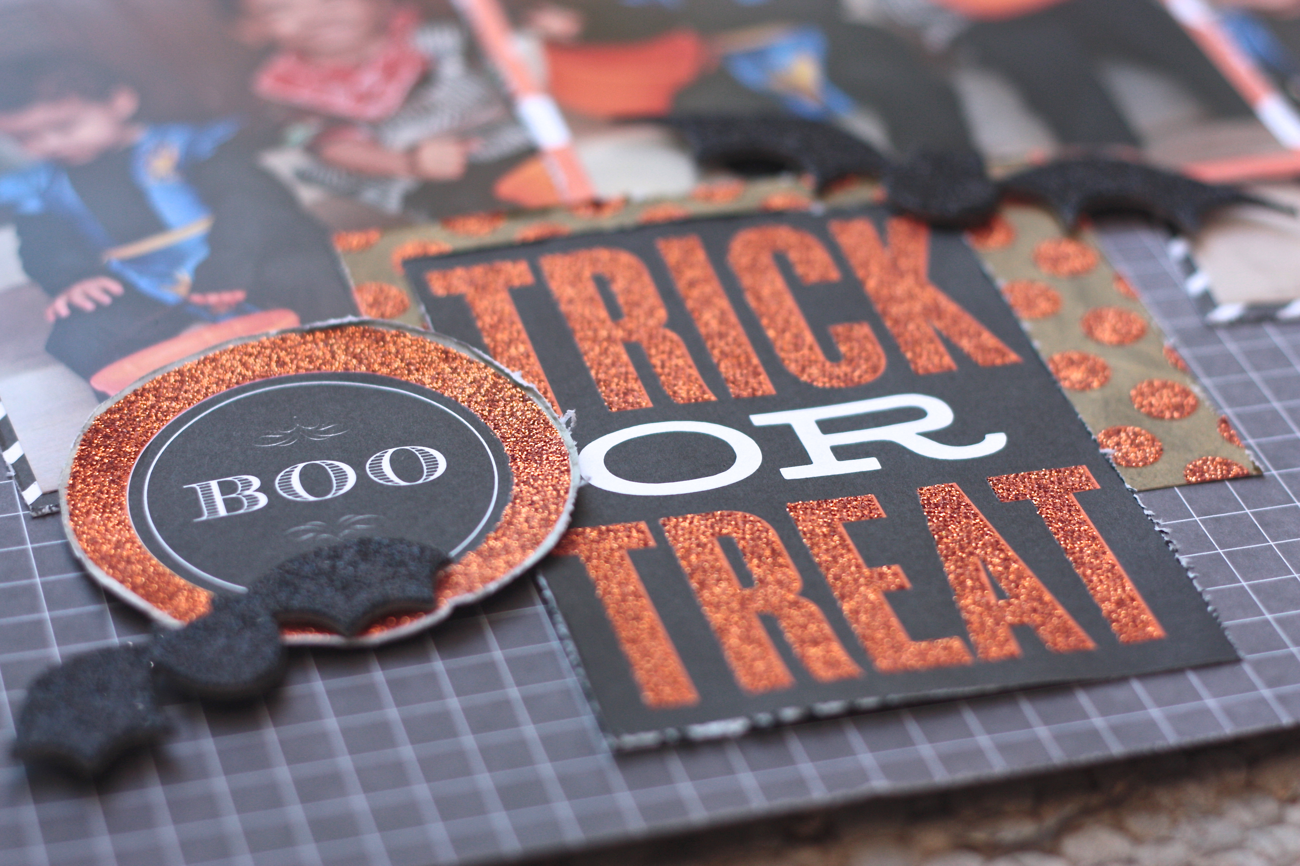 Punched out a fancy tab + chipboard sticker + bats = first completed 12 x 12 page in over two years.