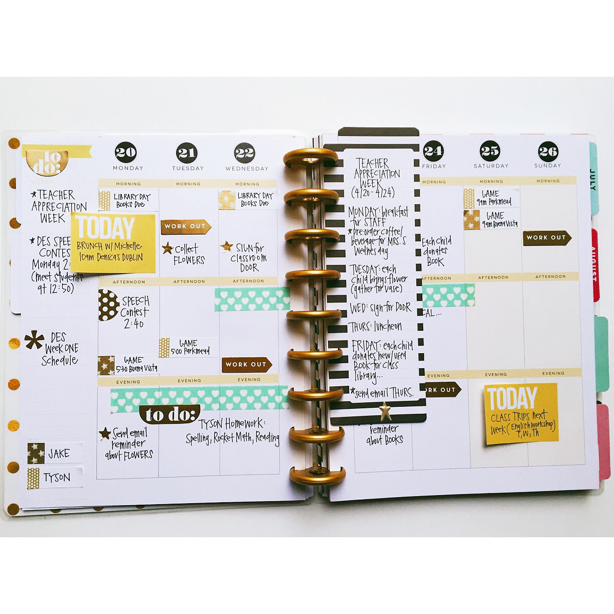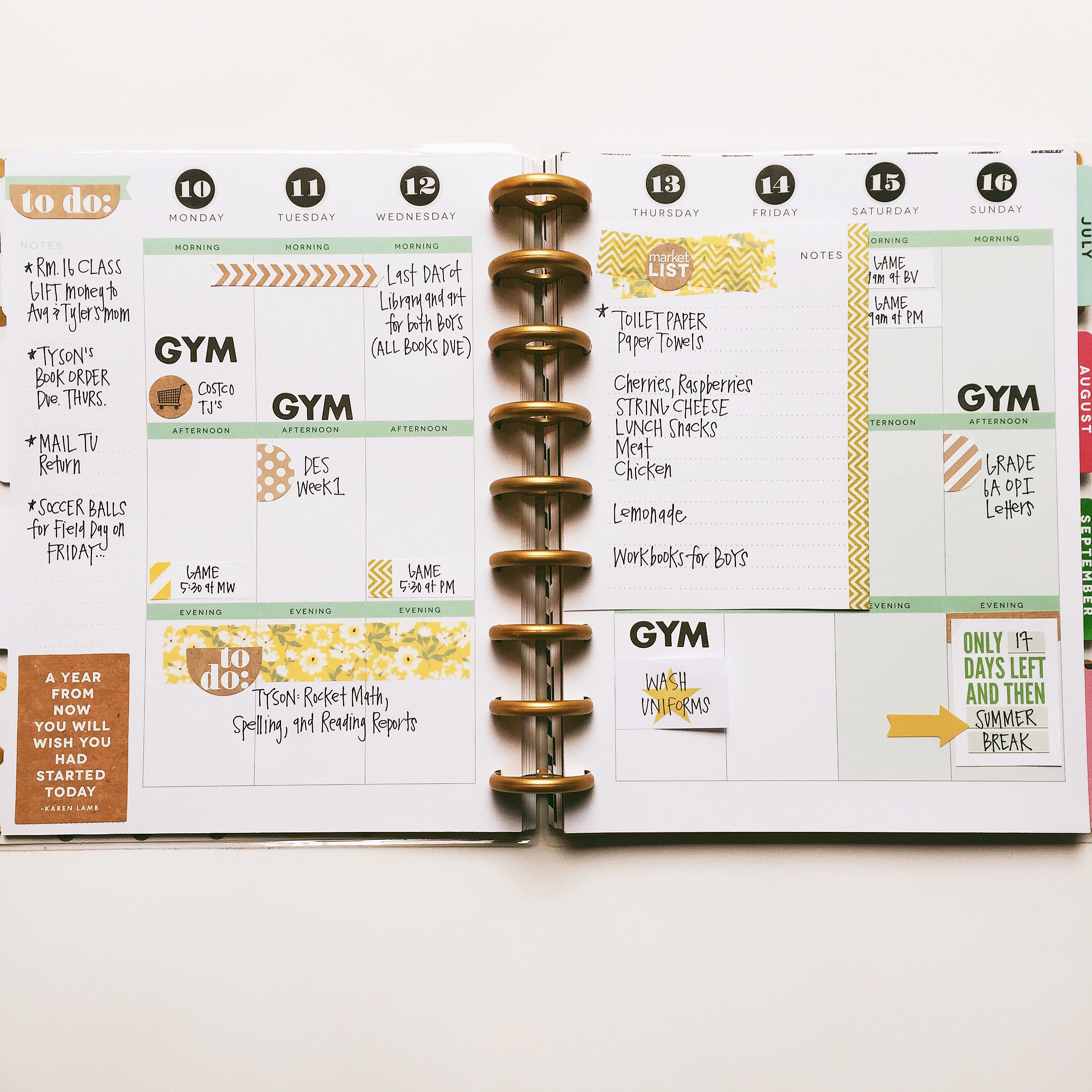 I work with my pages removed from my planner (no more wrist gymnastics needed to fill in Tuesday and Wednesday). While planning, I keep my boys’ game schedules, school calendars, and my school calendar in front of me and fill in the calendar accordingly.
