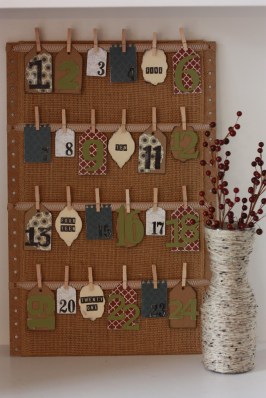 | Remaining section of $1 scrap peg board + piece of burlap + clothes pins + various pieces of scrapbook paper = fun advent calendar |