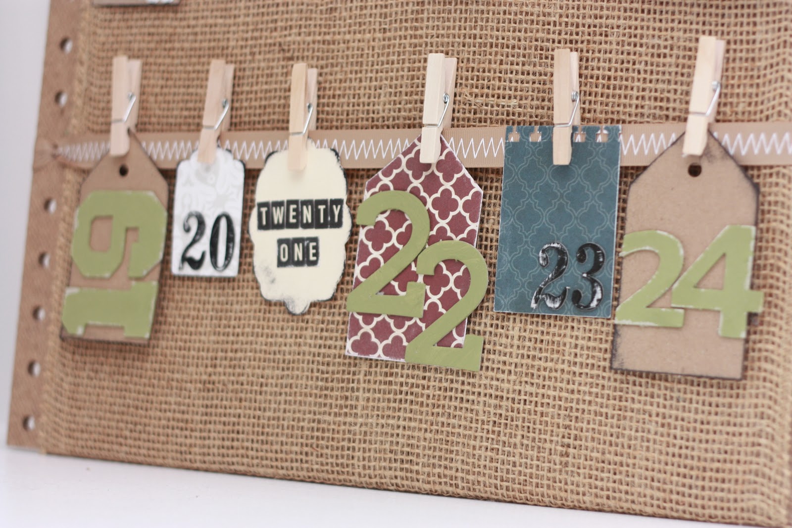 | Remaining section of $1 scrap peg board + piece of burlap + clothes pins + various pieces of scrapbook paper = fun advent calendar |
