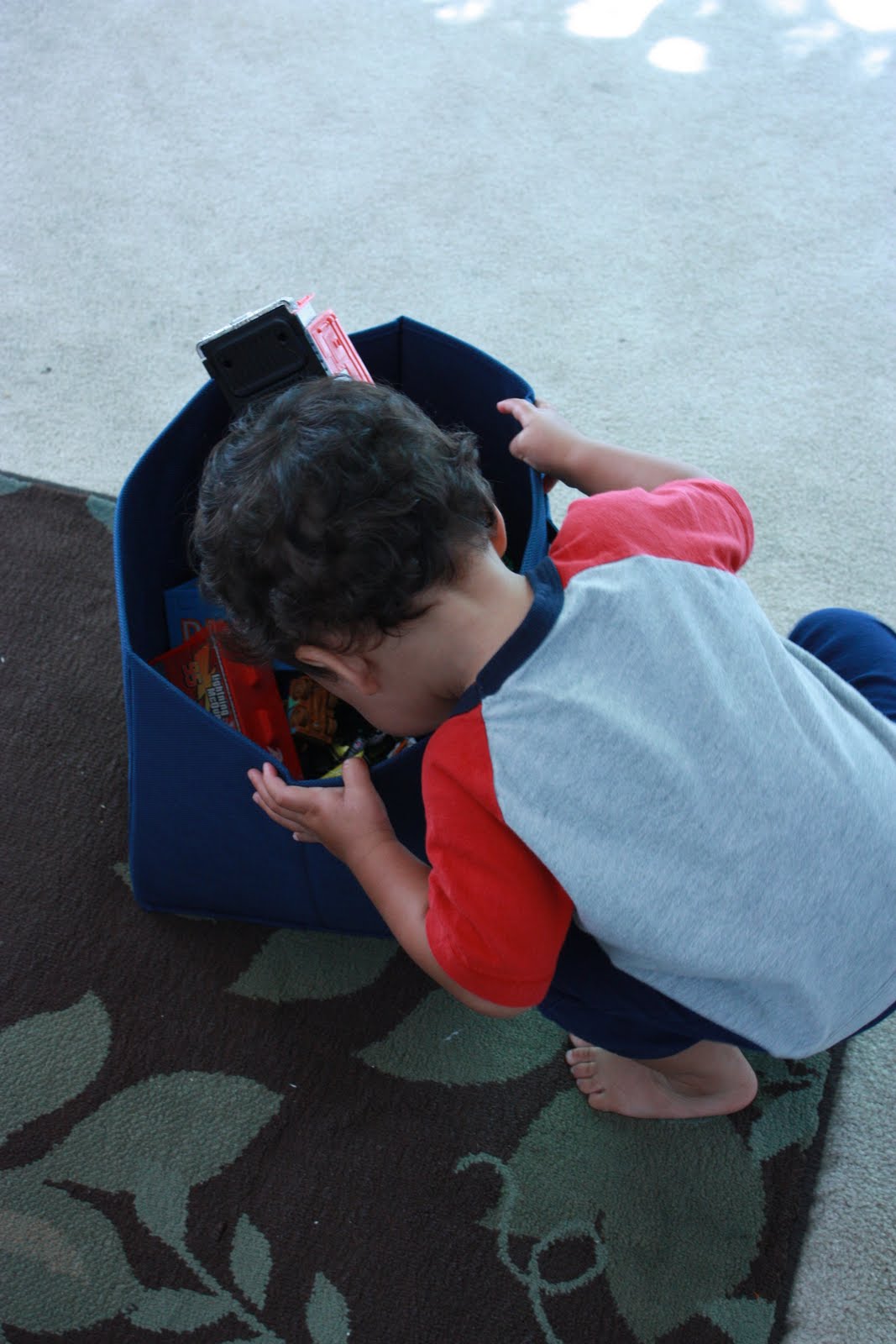 Takes a few minutes and then discovers his brother left out his bin of cars: