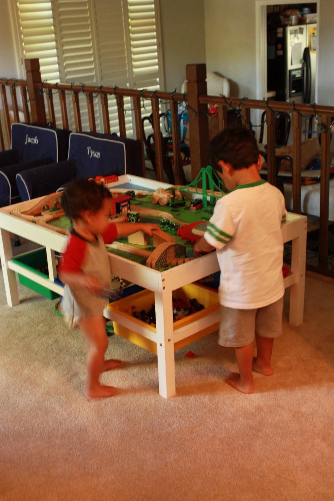I clean up the kitchen. Again. The boys run up to the playroom. Jake Lego’s again. Ty jumps: