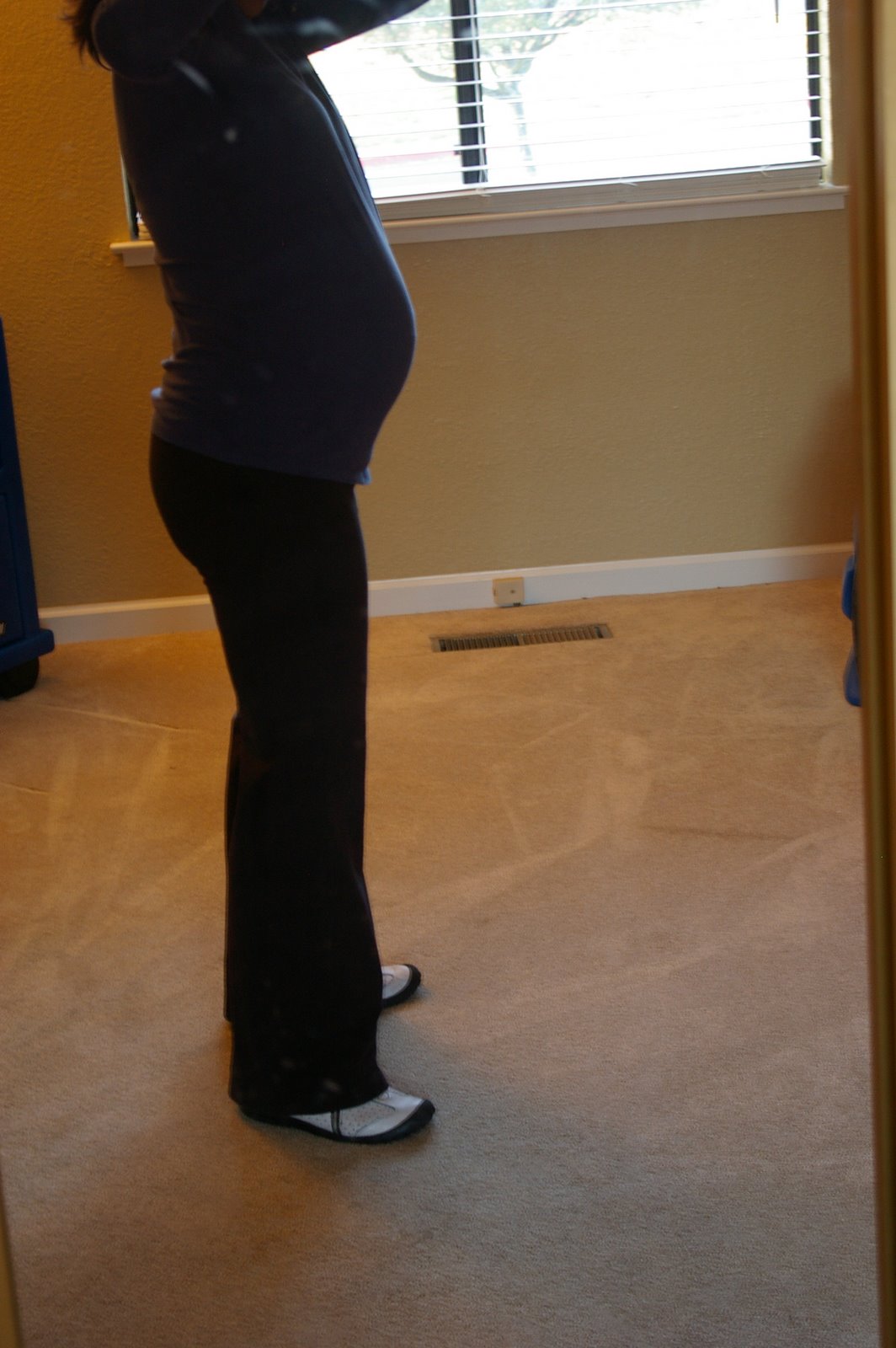 I’ll admit that these pictures were taken first thing in the morning and that the belly is a whole different phenomenon by the time I go to bed- after all, I seem to retain every single drop of water I come into contact with. By the end of the day, my belly, fingers, and feet take on a life of their own. I suppose the gabillion trips to the bathroom throughout the night are good for something…I wake up and have decent sized feet, belly, and fingers. If only the same could be said for the boo-hoo-tee.35/35