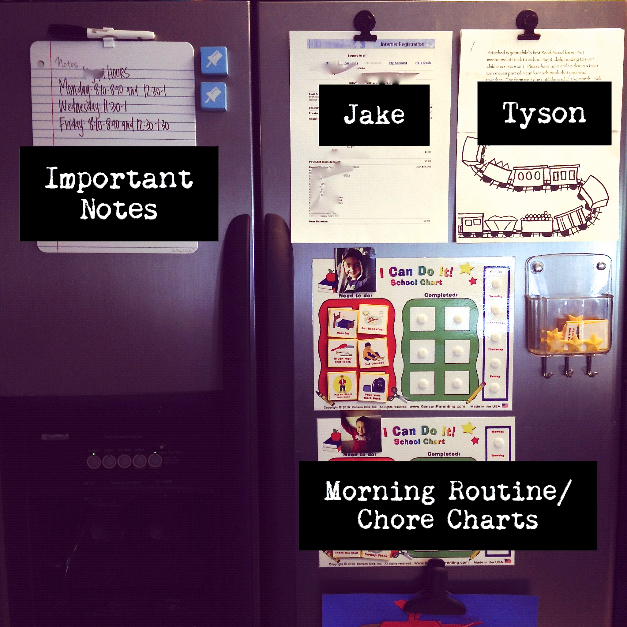 I wish we had a wall to devote to a family work station but we don’t. The calendar sits on our kitchen counter where it is clearly visible. On our fridge, I have one clip for Jake’s important papers/schedules/etc. and one for Tyson. Their morning routine/chore charts, which have proven invaluable hang below. For longer term papers/notes, each child has a folder in a standing organizer next to the big calendar on our kitchen calendar: