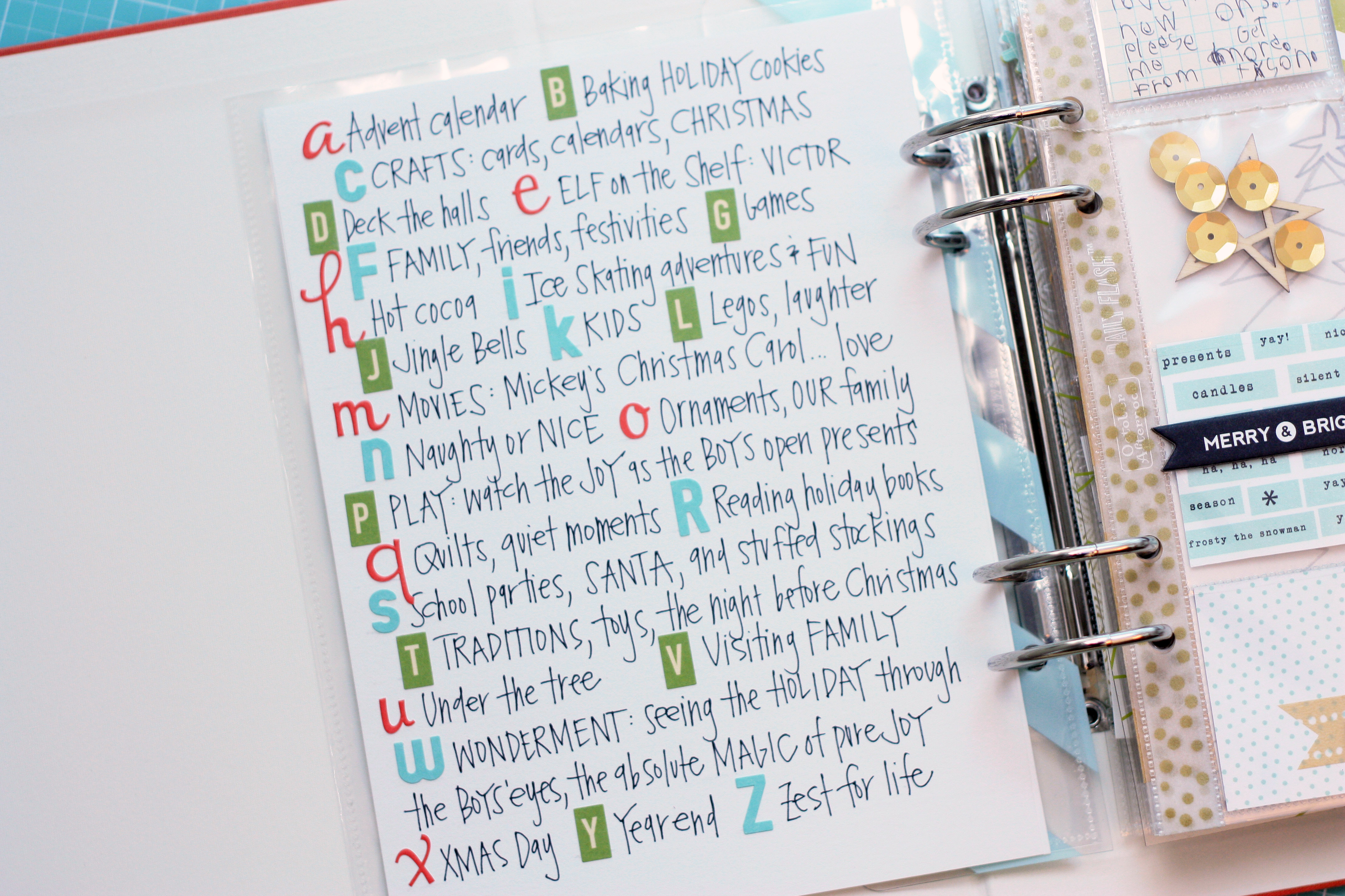 I started to list all of the items/photos/moments I hope to capture in December. As I was doing so, I decided to turn the list into a filler page. A fun, colorful, alphabet page followed…