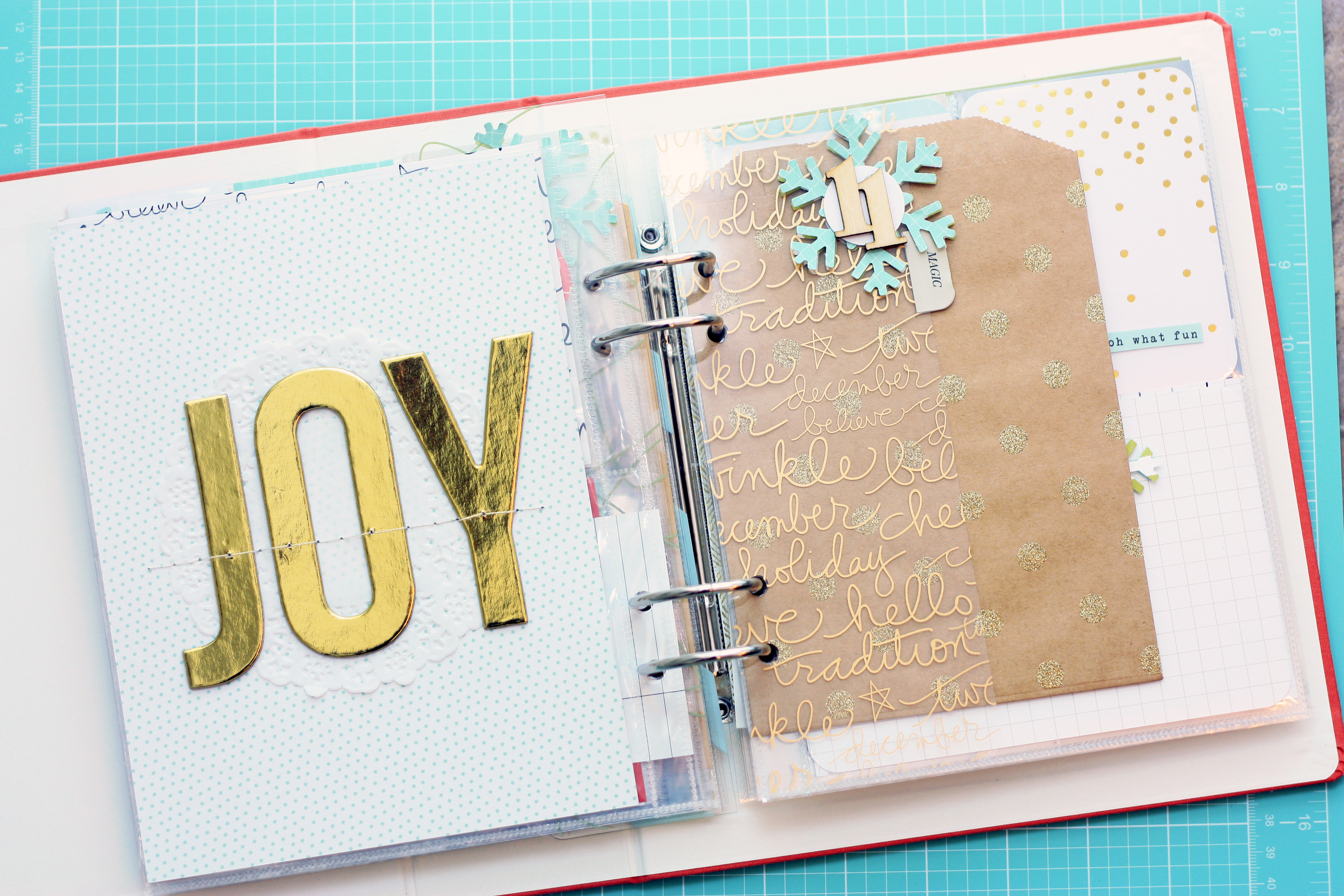 I fell in love with the black and gold me & my BIG ideas Christmas paper pad the minute I saw it. Glittery accents, gorgeous fonts, gold foil…swoon. And then I came across this kraft colored blank calendar sheet at Hobby Lobby. Done. Having never completed my keepsaking of December 2013, I finally got it done: