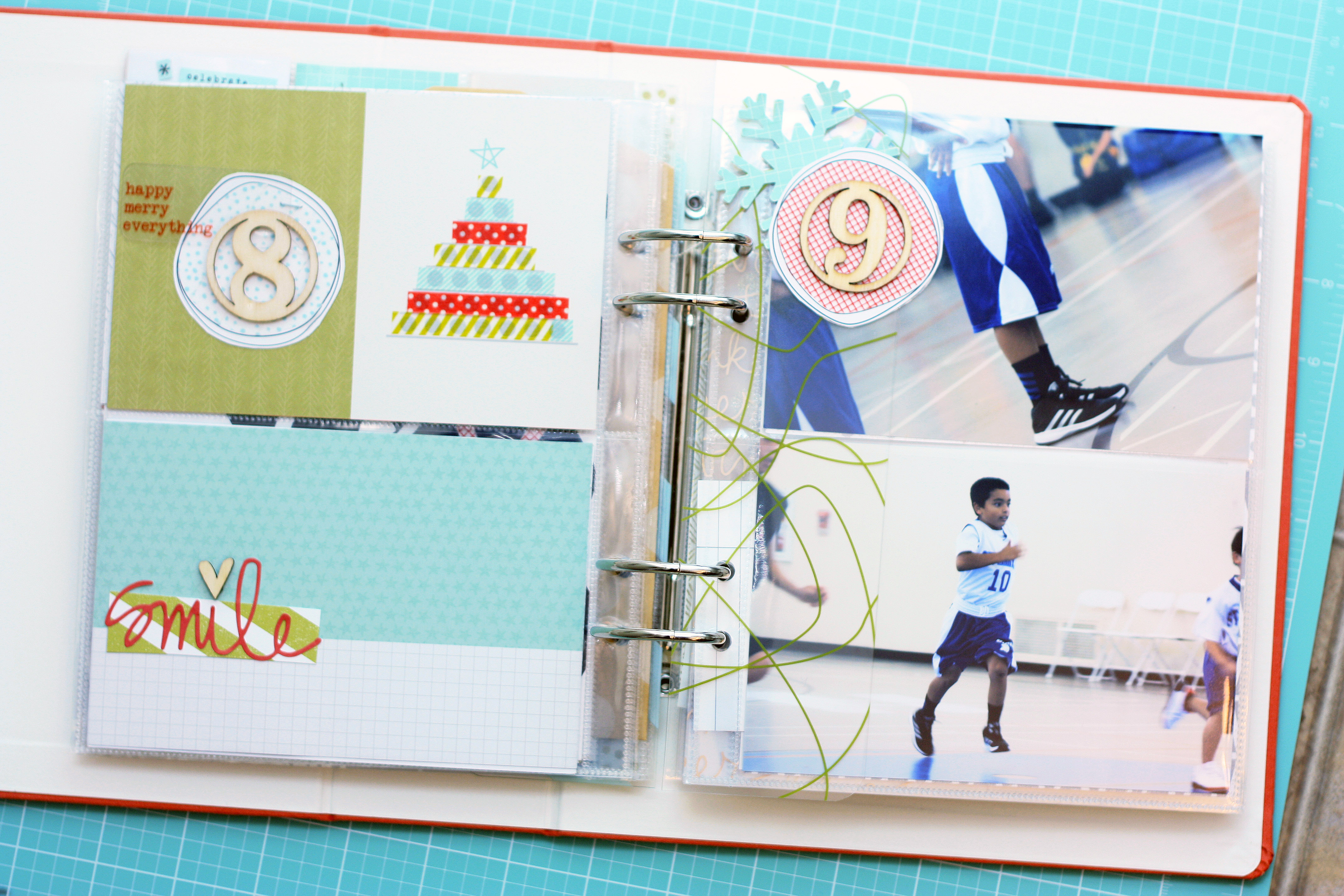 Moments 8 and 9 will focus on the boys’ basketball. The 9 is adhered to a clear Project Life page divider. Loved the hint of green it offered to keep with the blue/green/red color scheme of the double page layout.