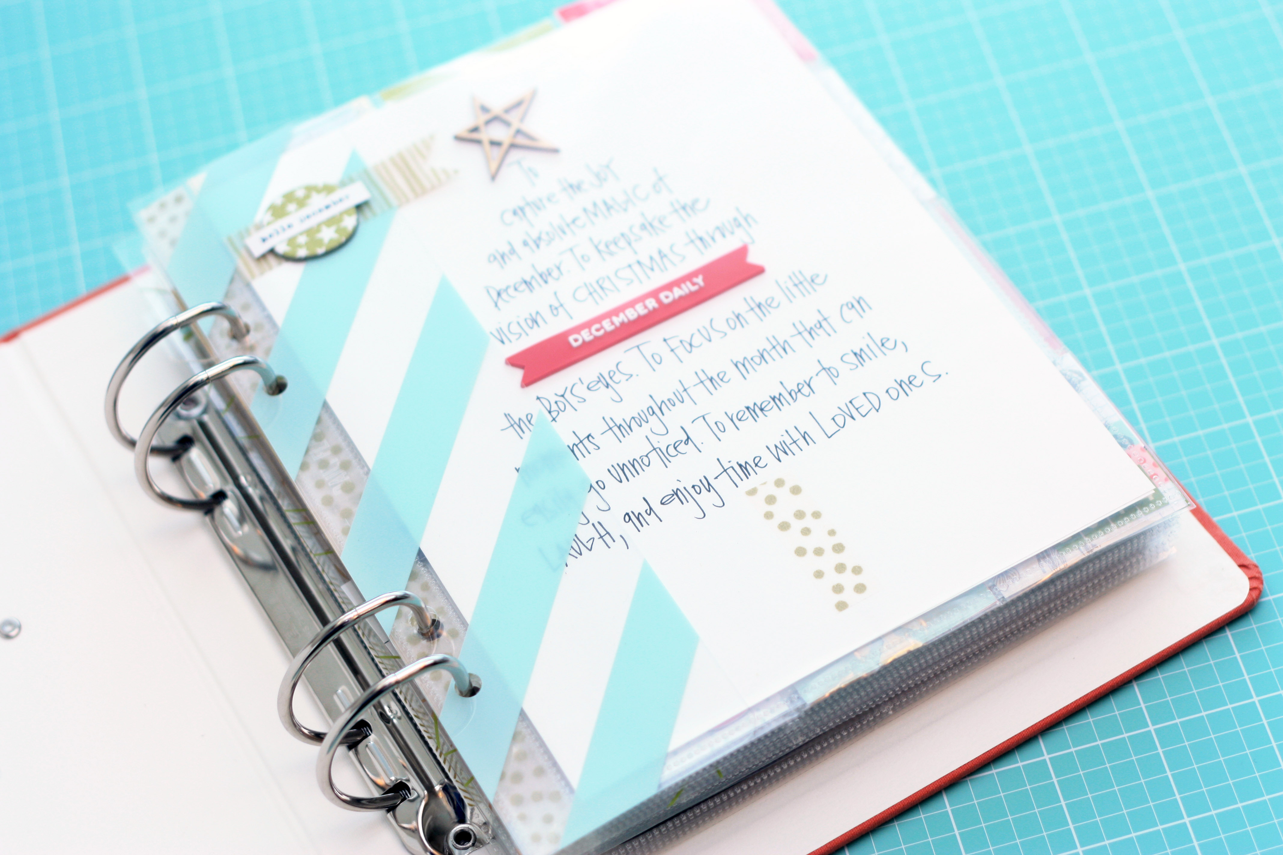 As you will see throughout the album, I am using a mixture of pre-made journal cards, the ones that came with the Ali Edwards December Daily Kit and handwritten, list/journal type pages. For the opening WHY page, I loosely made lines with a pencil. Journaled my why, erased the pencil lines, and added embellishments. Simple but love the outcome.