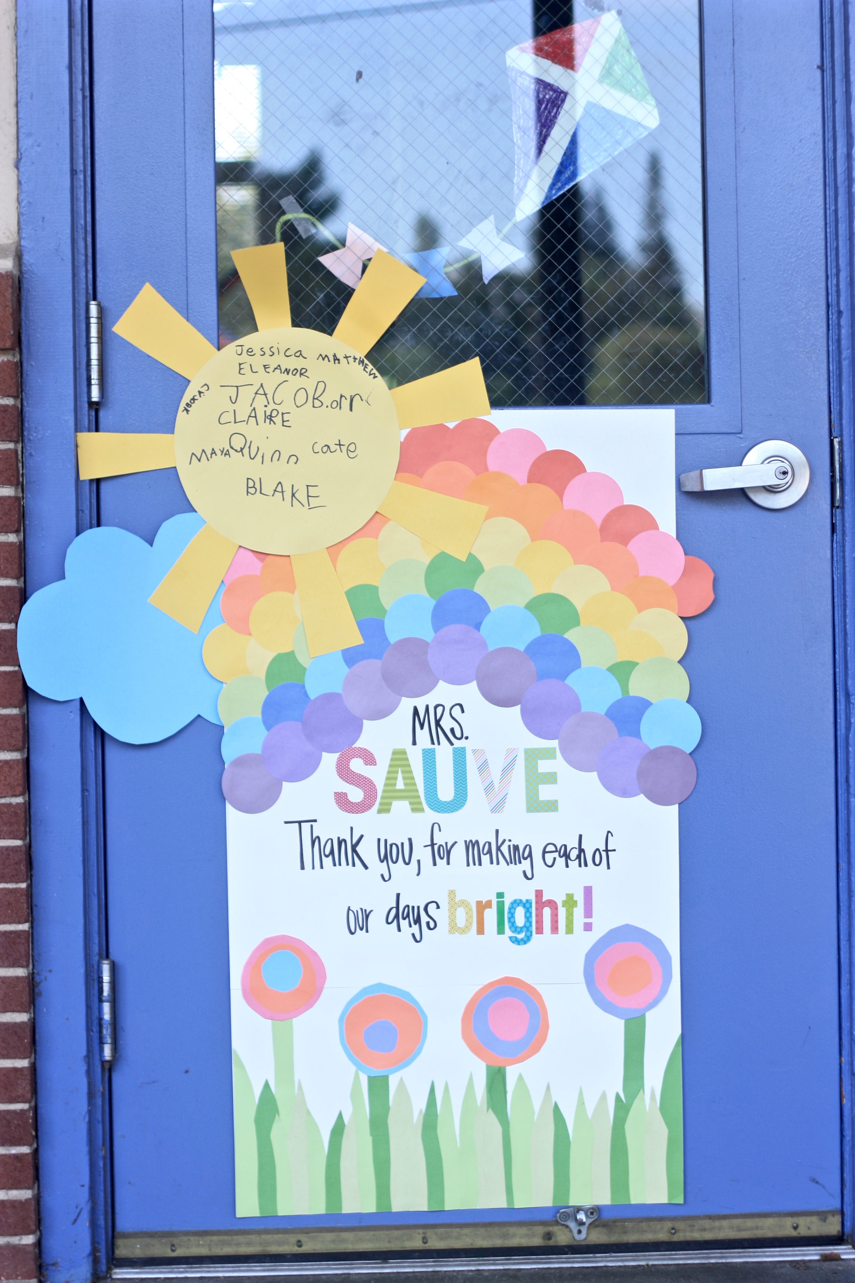 Posted: April 21, 2015 Filed under: Arts and Crafts, Mommy Notes, Scrapbooking Leave a commentReally happy with the way this came out…love the fun, bright feel and texture of different pieces of cardstock. The rainbow: lots of various circle punches glued to mimic a rainbow shape. For the flowers, I wanted imperfect circles to help connect the top of the sign with the bottom. For the grass, I had the boys help cut pieces and glue them on. The me & my BIG ideas big alpha stickers were the perfect finishing touch. The last of the kiddos will sign the cloud tomorrow morning ❤