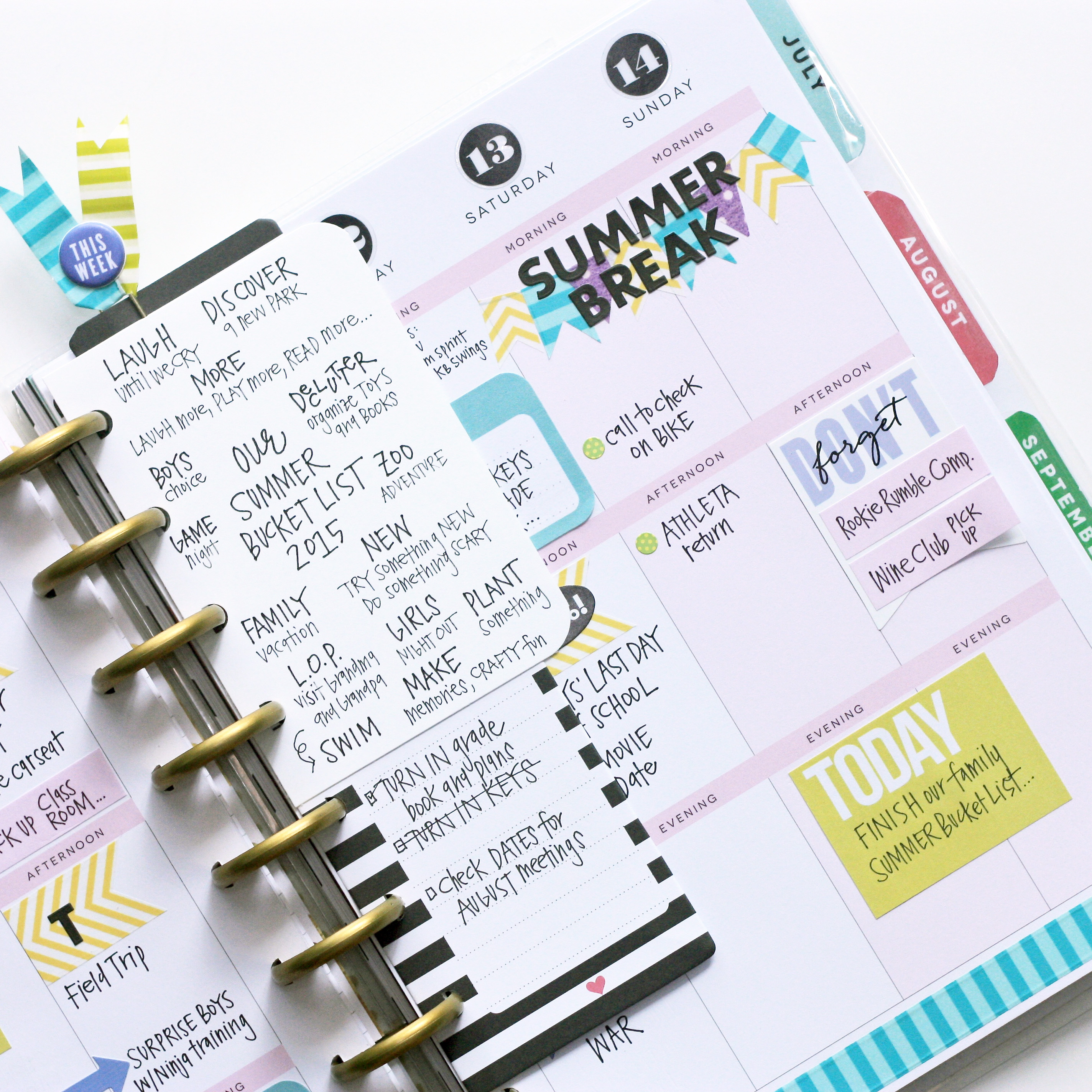 Posted: June 14, 2015 Filed under: Planner Love, Project Life, Scrapbooking 1 CommentConstructing our family Summer Bucket List has become one of my favorite summer traditions. This year, I went with a texture and chalkboard theme. I plan to use the clips to attach photos of our adventures. There is a small envelope in the bottom corner housing a few of our activities that didn’t fit in the clipped tagged area. Looking forward to a summer of fun, laughter and adventure. I also made a small portable version of our bucket list to carry with me in my me & my BIG ideas The Happy Planner. I love summer ❤