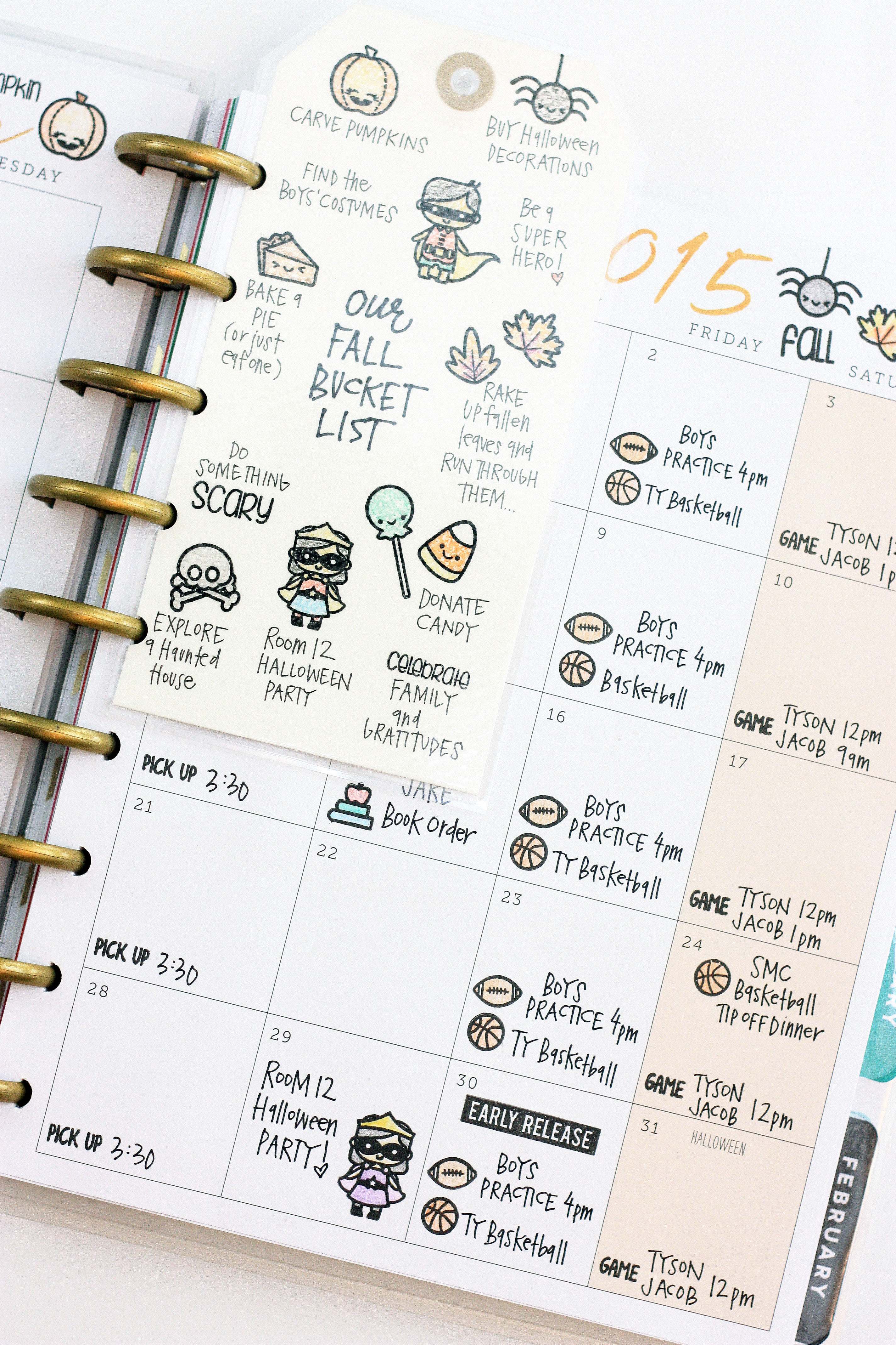 I work with my pages removed from my planner (no more wrist gymnastics needed to fill in Tuesday and Wednesday). While planning, I keep my boys’ game schedules, school calendars, and my school calendar in front of me and fill in the calendar accordingly.