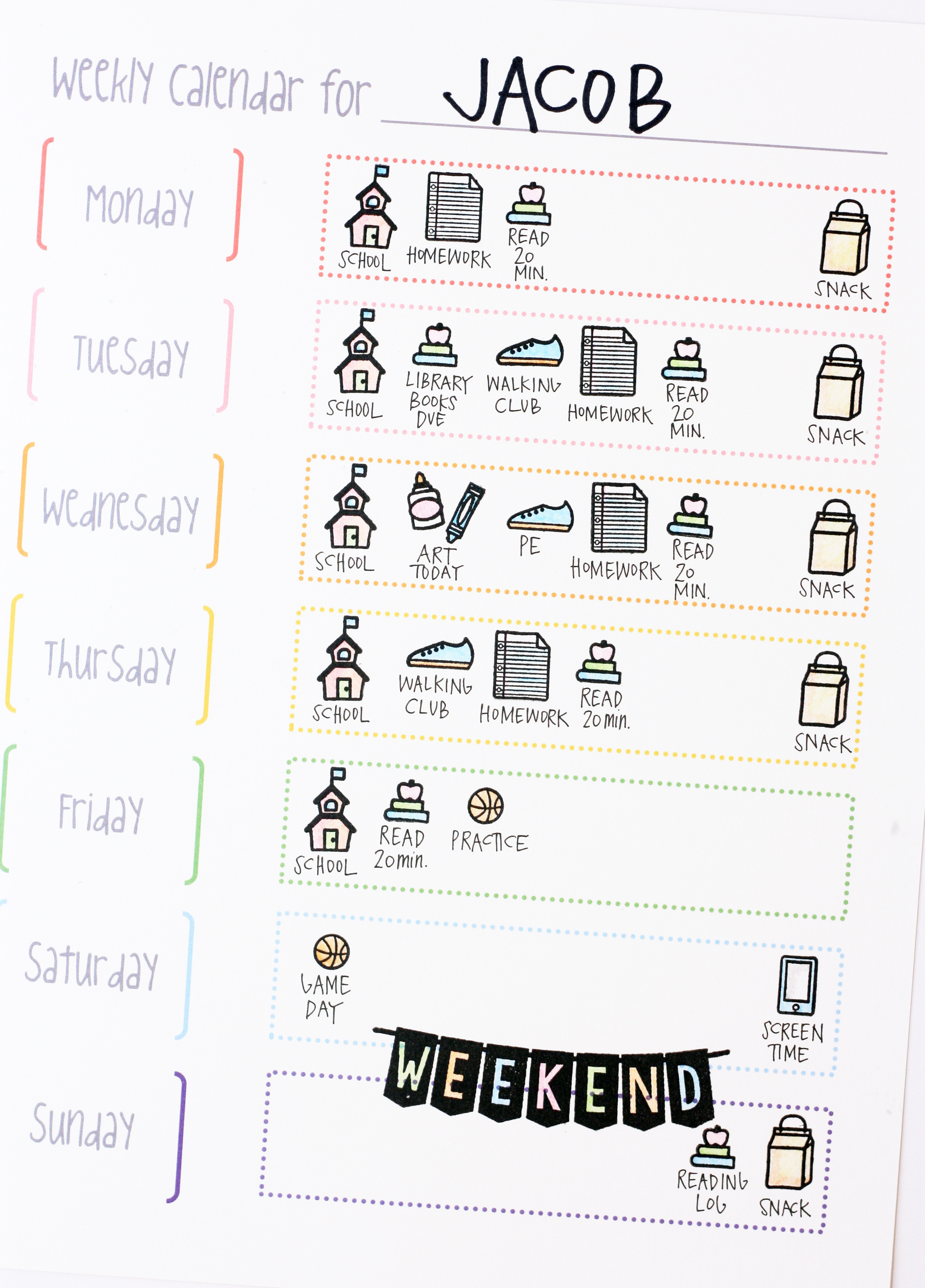 I love that this chart provides visuals for Jake. It is easy for him to take control of his morning routine and get himself ready accordingly. Tuesdays are library days: make sure your library book is in your backpack. Before bed, make sure you’ve packed your snack. Wednesdays are art days, don’t wear your favorite t-shirts as you may get messy. PE and Walking Club days call for sneaks, no Chucks.