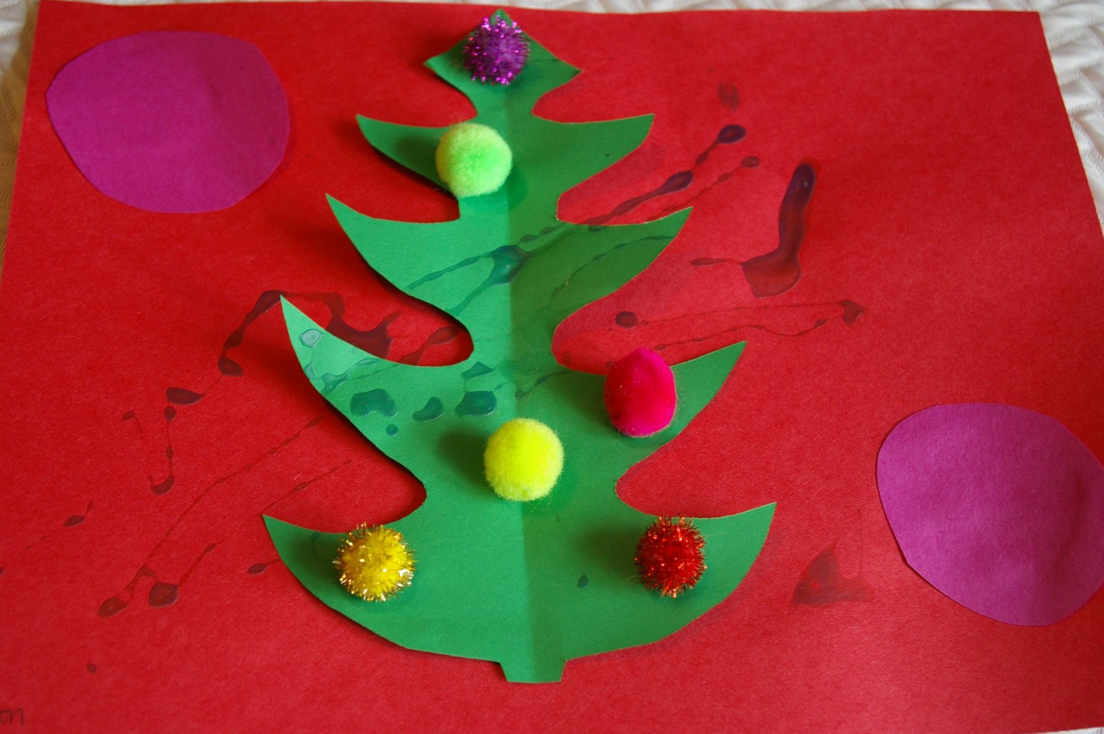 Posted: December 16, 2008 Filed under: Arts and Crafts, Tyson Leave a commentAlmost every week at toddler class there is a table set up with an arts and crafts project for the kids. Ty usually slows down to watch the other kids but hasn’t shown much interest until this week. He sat down and started to decorate his tree. He LOVED drizzling the colored glue all over the paper and I think his favorite part was dipping the puffs into the paint and smashing them onto the page. He had fun. His first real “school project”…