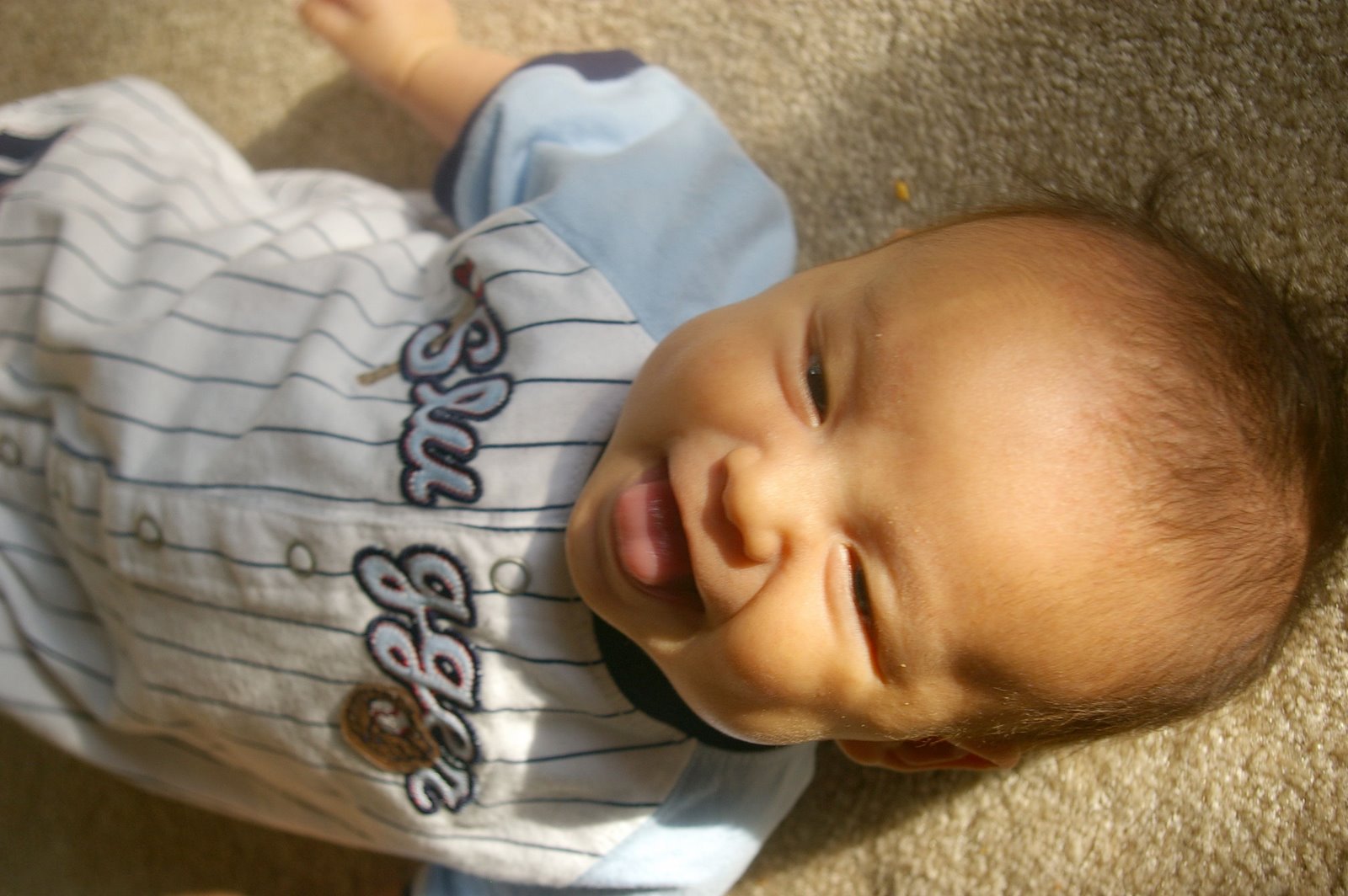 The pic is a little blurry because Ty is playing one of his new favorite games- shake his head until he falls, which never takes long. Every morning, without fail, I get the smile and the mean case of bed head. Note that it was light enough outside to get a decent picture- a HUGE step for us as we usually have to turn the lights ON to greet Ty.Ty’s 1st Year Montage- Well, First 14 Month Montage