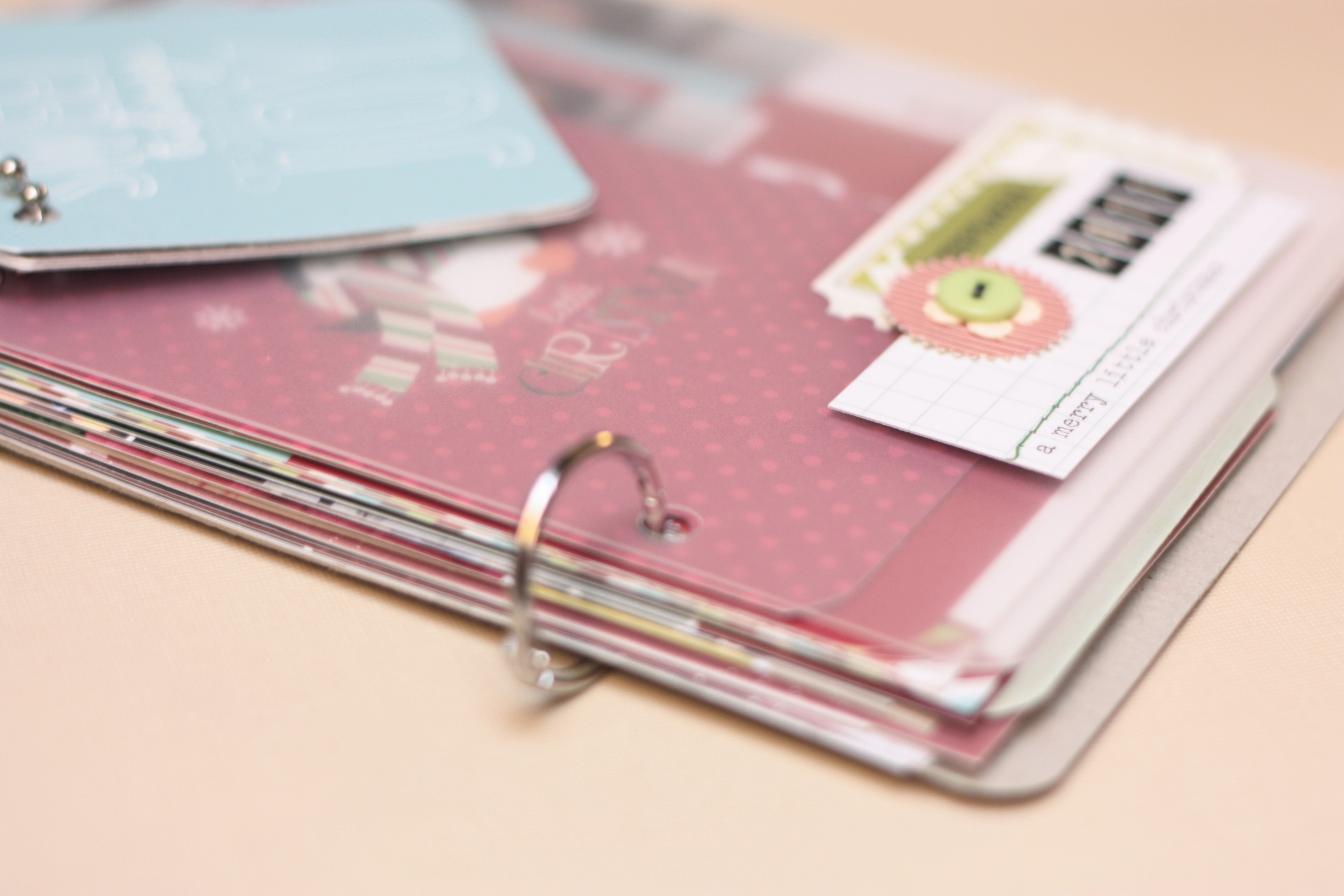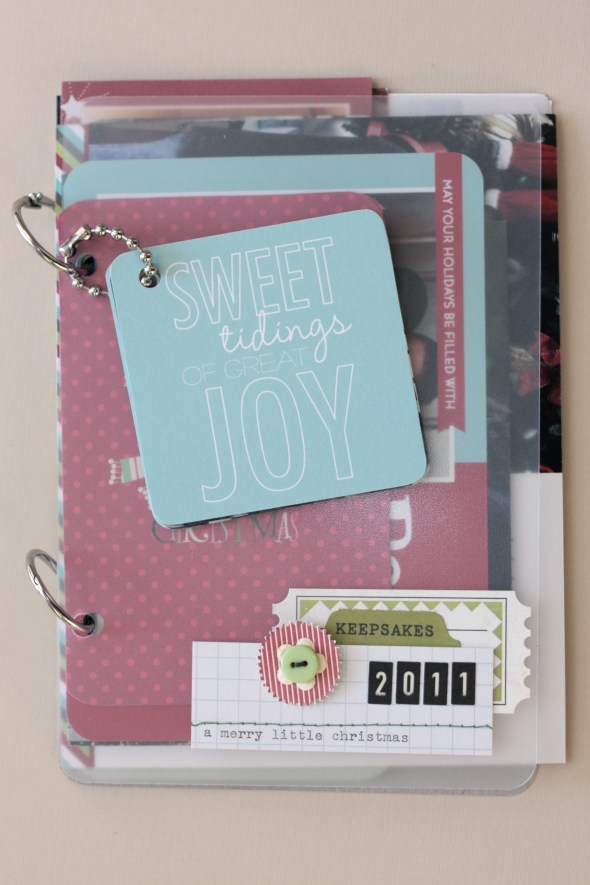 Posted: January 9, 2012 Filed under: Goals, Holidays, Scrapbooking | Tags: nurture: creativity, nurture: organization Leave a commentSuper simple solution to make all the photo cards we received this Christmas into a keepsake booklet. Just punch holes, add binder rings, voila – done. I added a piece of thin cardboard to the back and a clear plastic page for the front for stability.